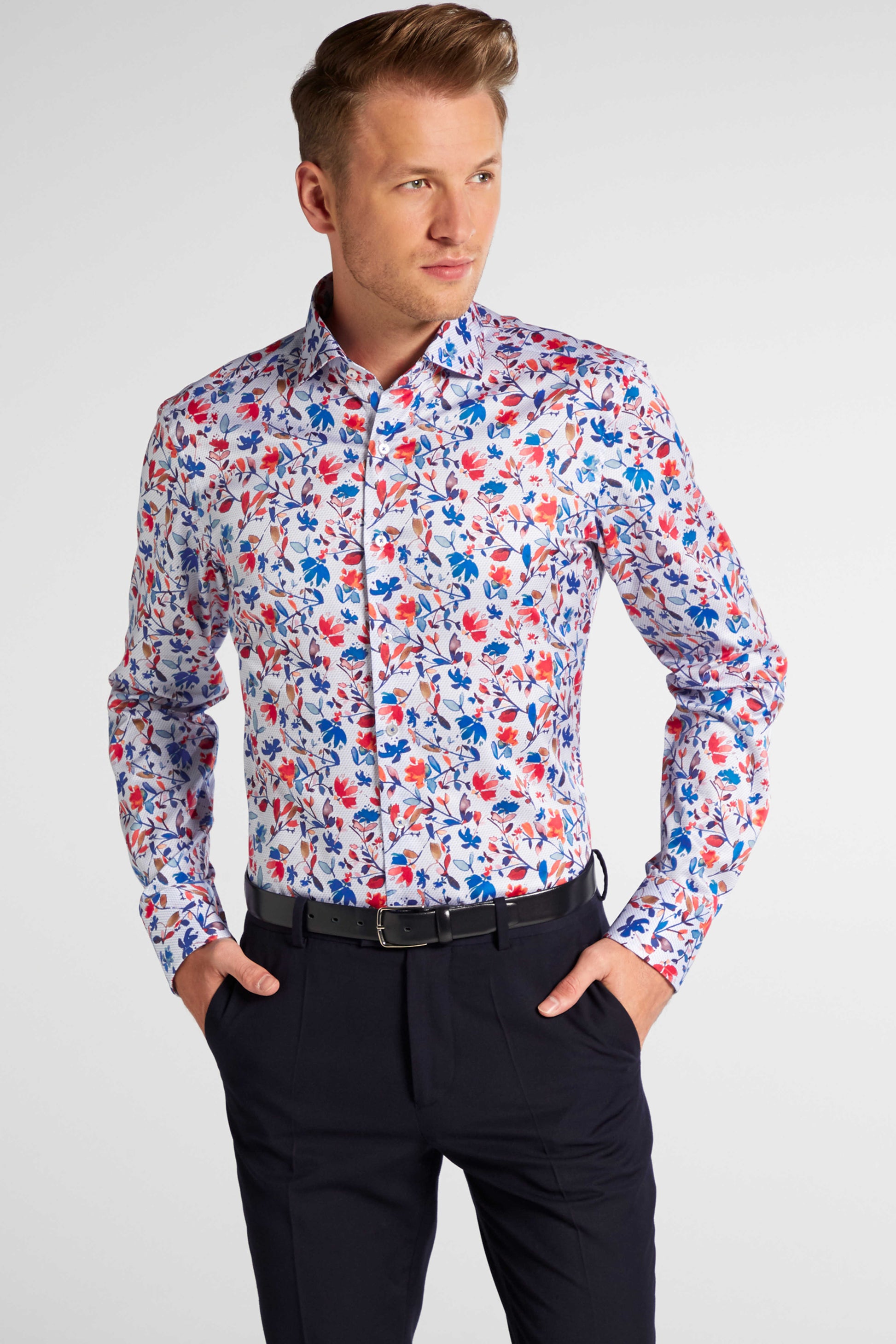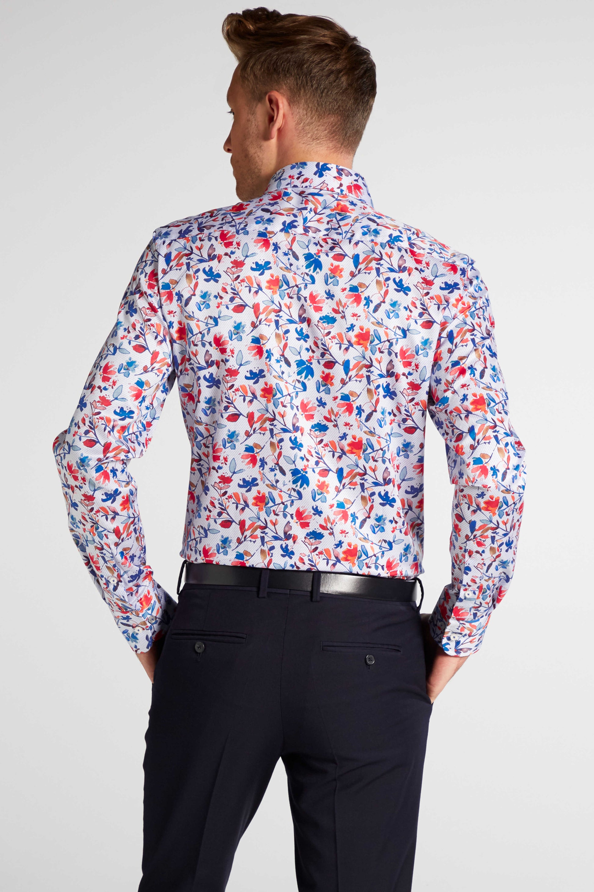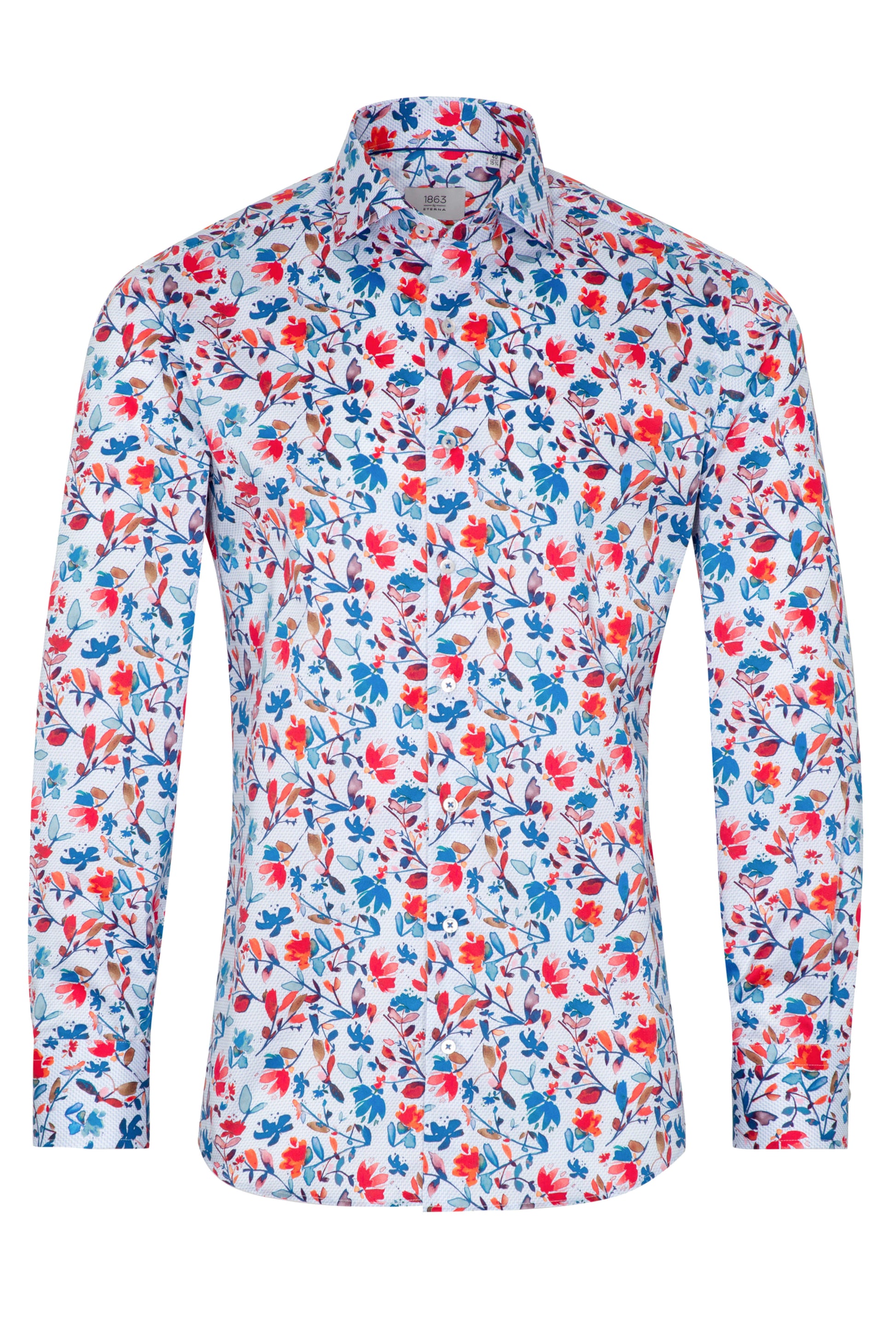 Designet imponerer med sit skarpe grafiske print i rødt og blåt med subtilt blomstermotiv. Skjorten har en moderne cut-away krave, uden brystlomme, og høje, flotte italienske knapper syet på stilk – et klart tegn på premium håndværk.