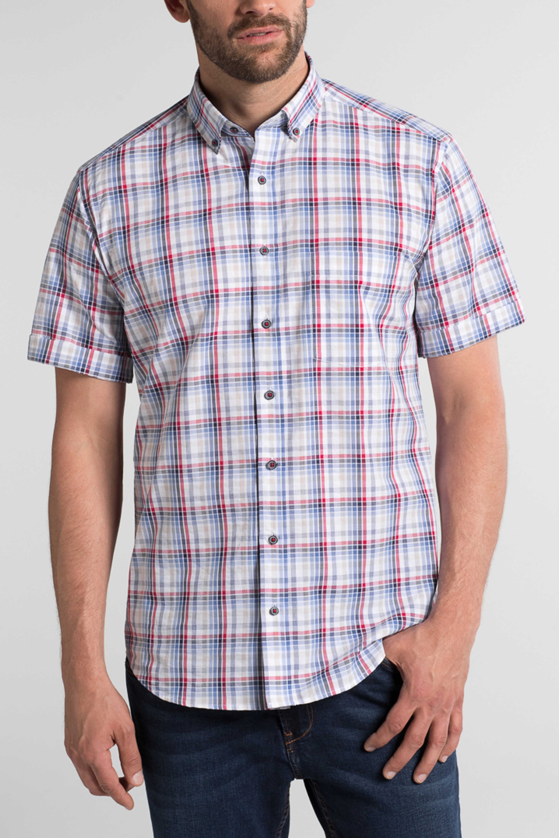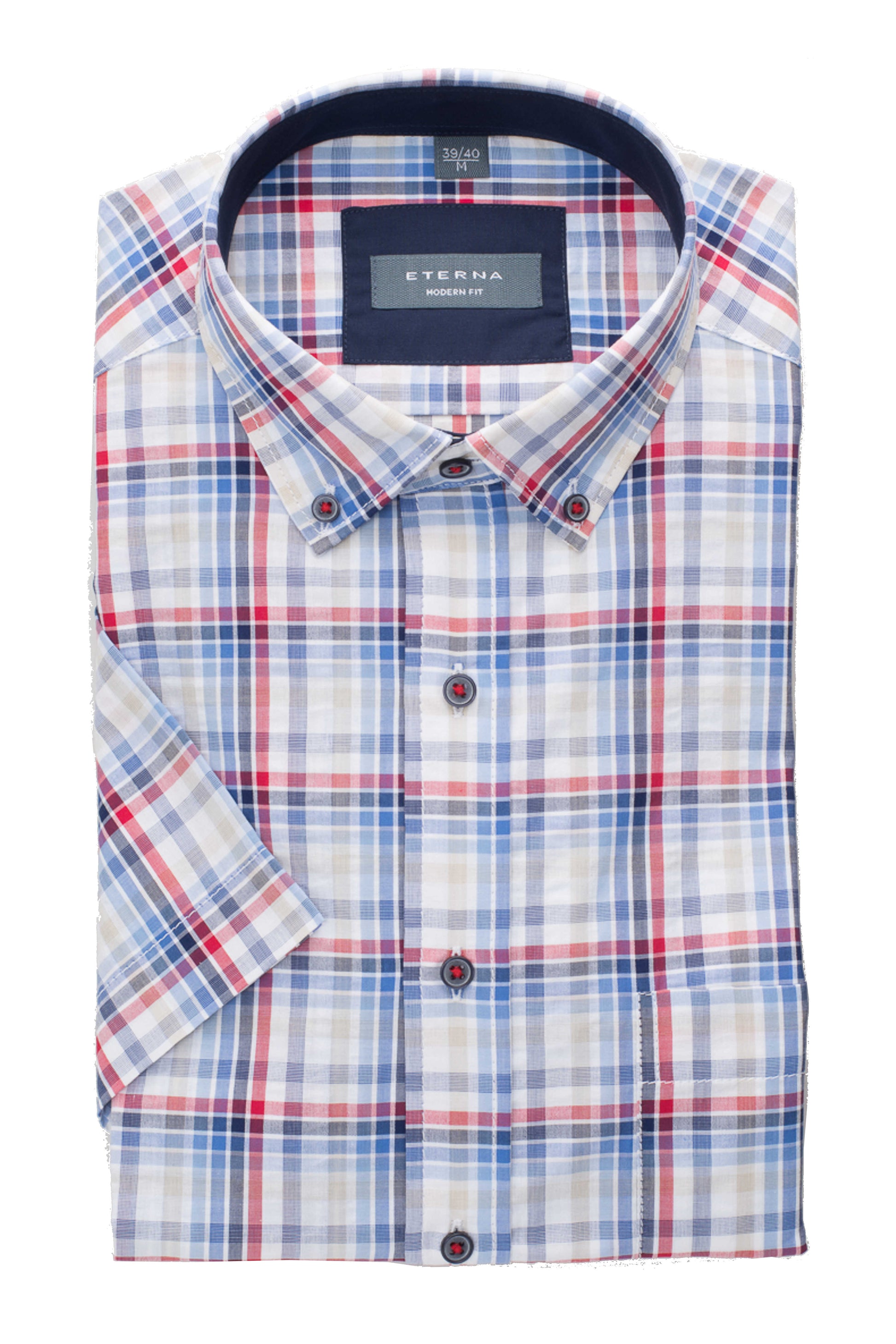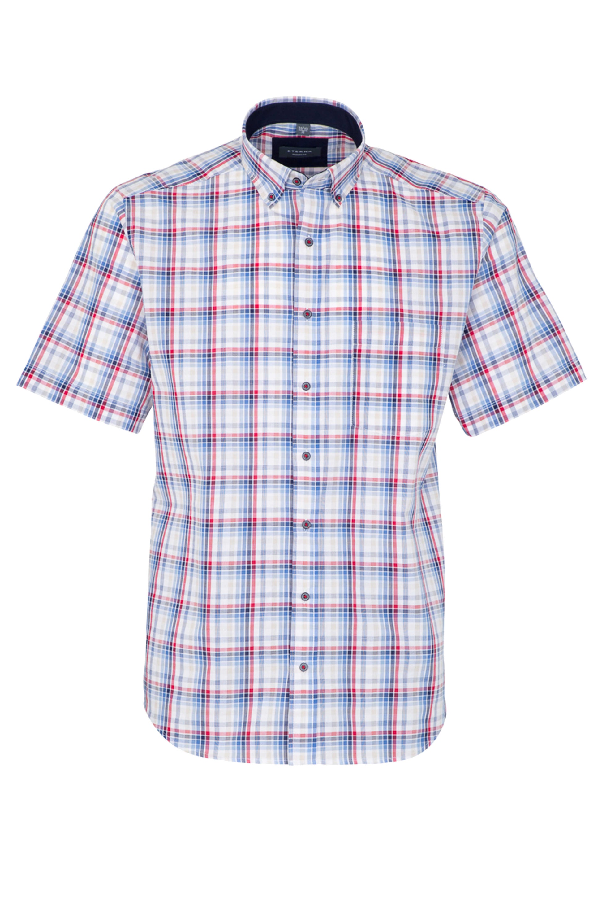 Flot og sommerlig kortærmet skjorte fra Eterna i ternet design med farverne blå, rød og sand. Skjorten er designet med brystlomme, button-down krave med kontrastfarve samt mørke knapper syet med rød tråd, der giver et stilfuldt spil i detaljerne.