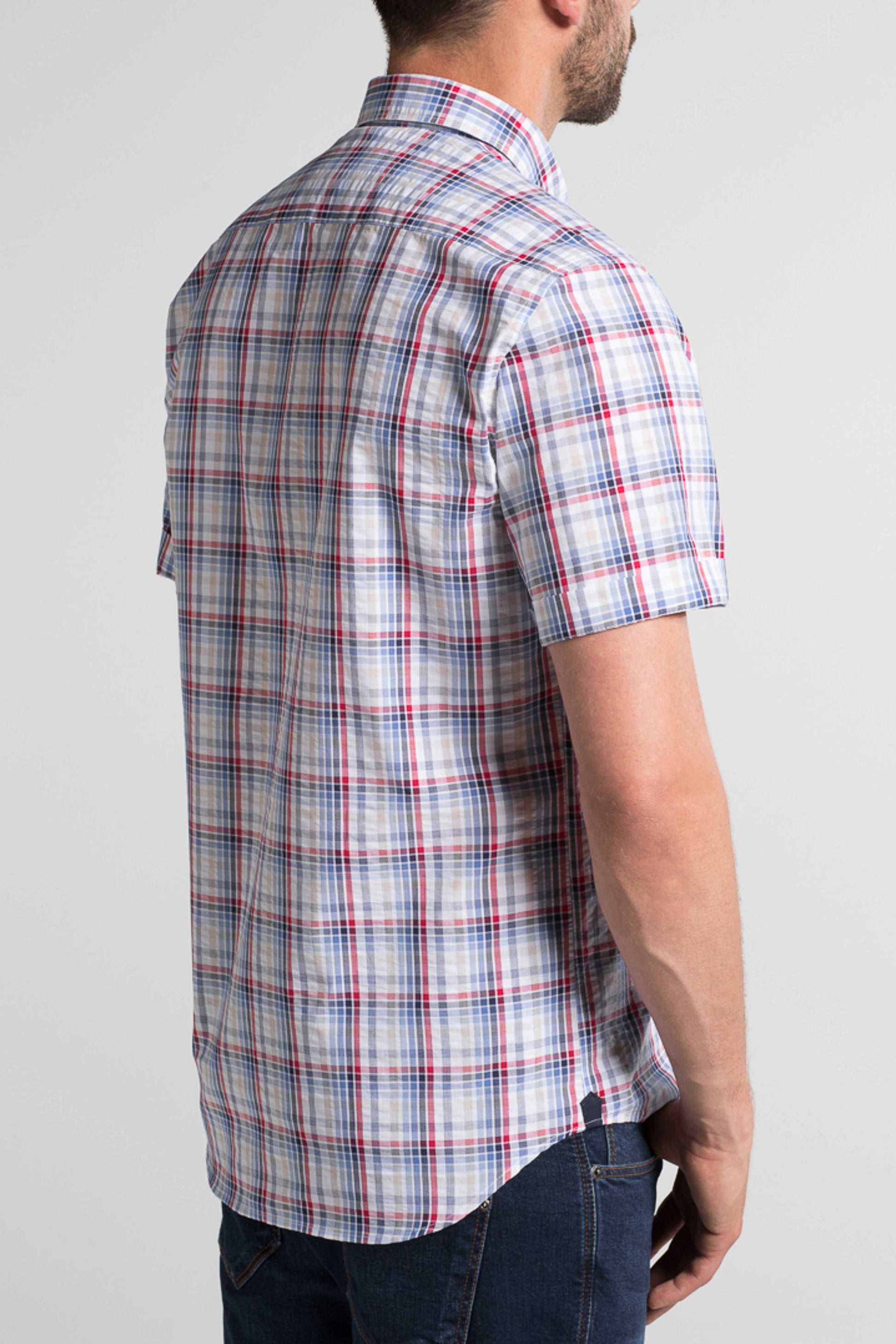 Eterna Comfort Fit – Kortærmet ternet skjorte i blå/rød/sand (Seersucker)