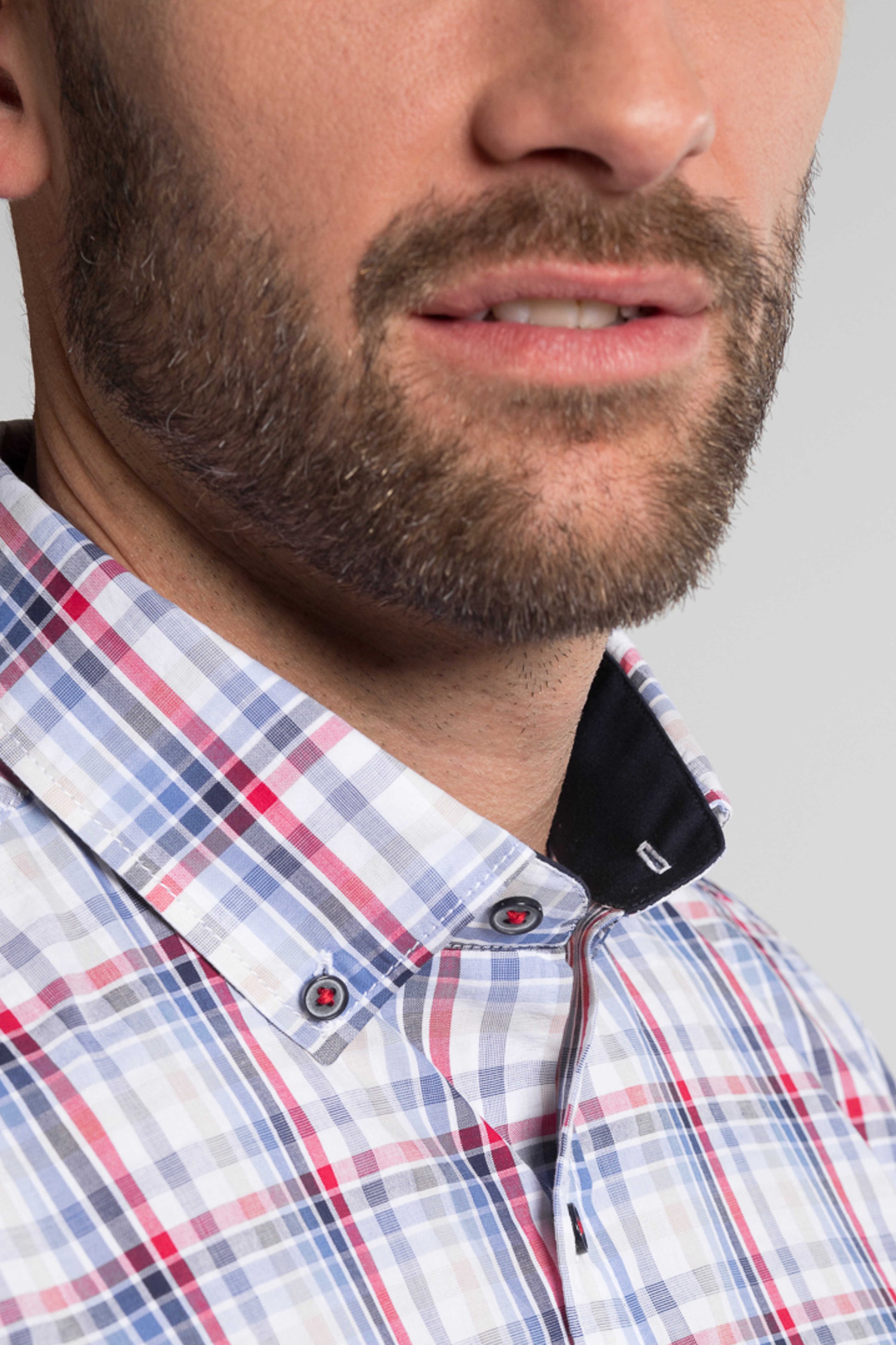 Design: Kortærmet, brystlomme, button-down krave med kontrast, mørke knapper m. rød tråd