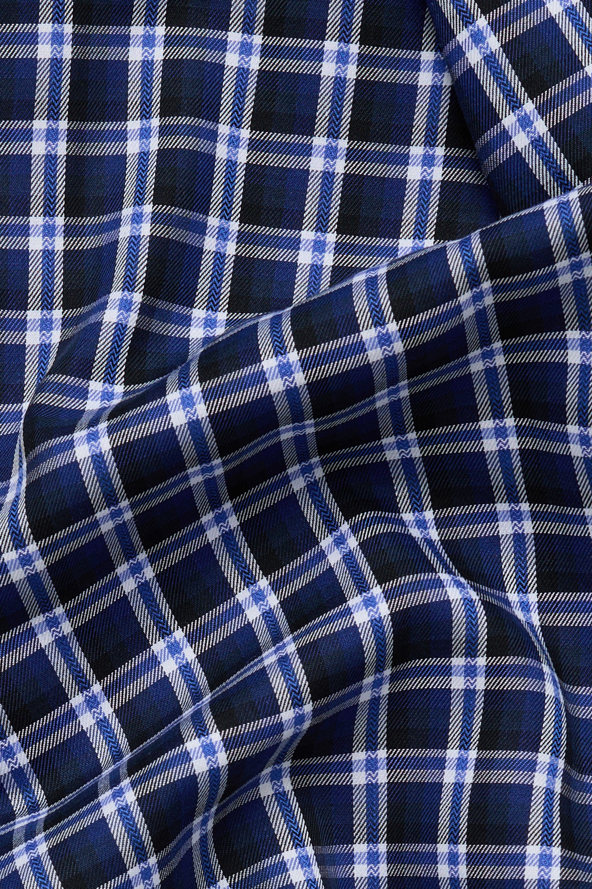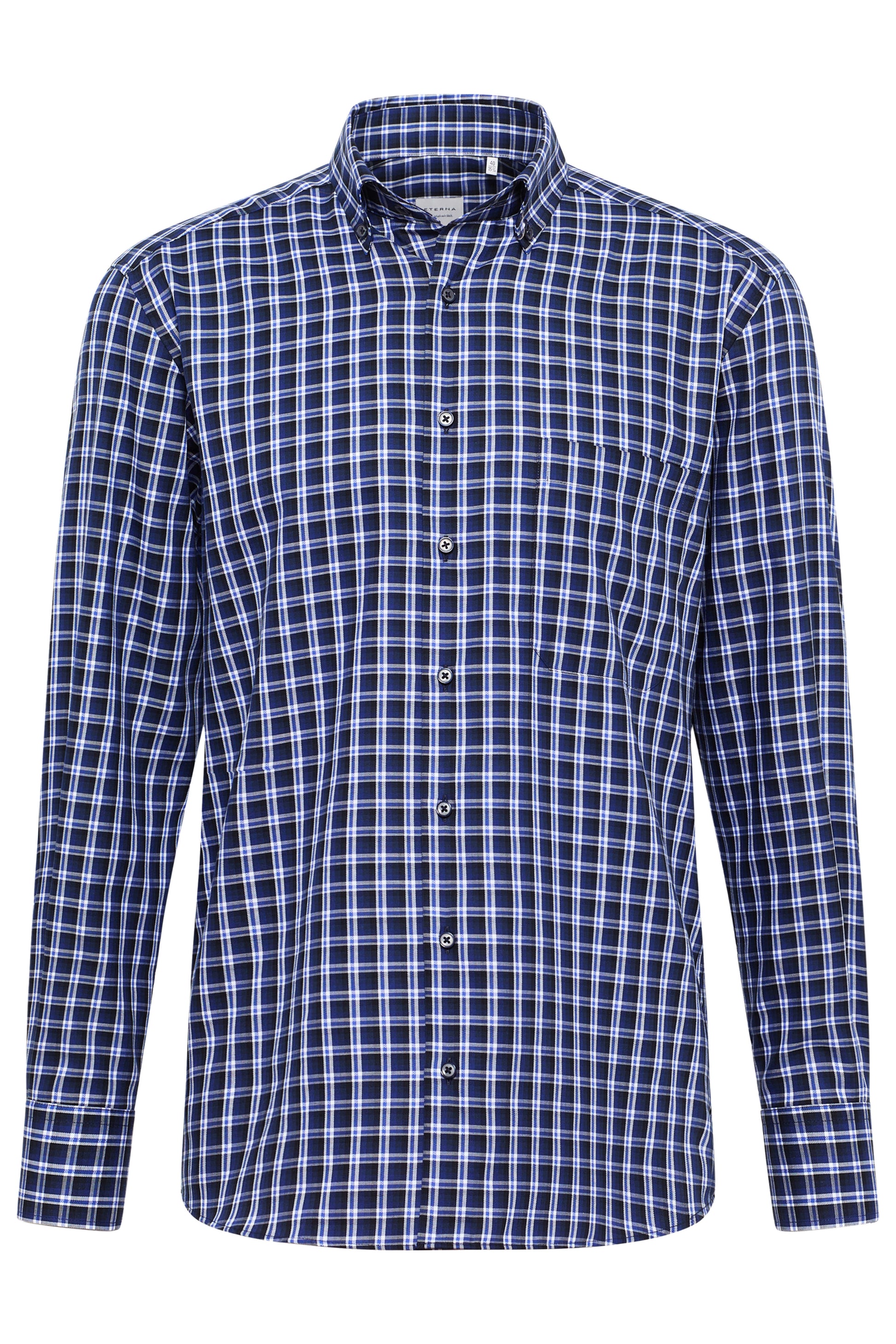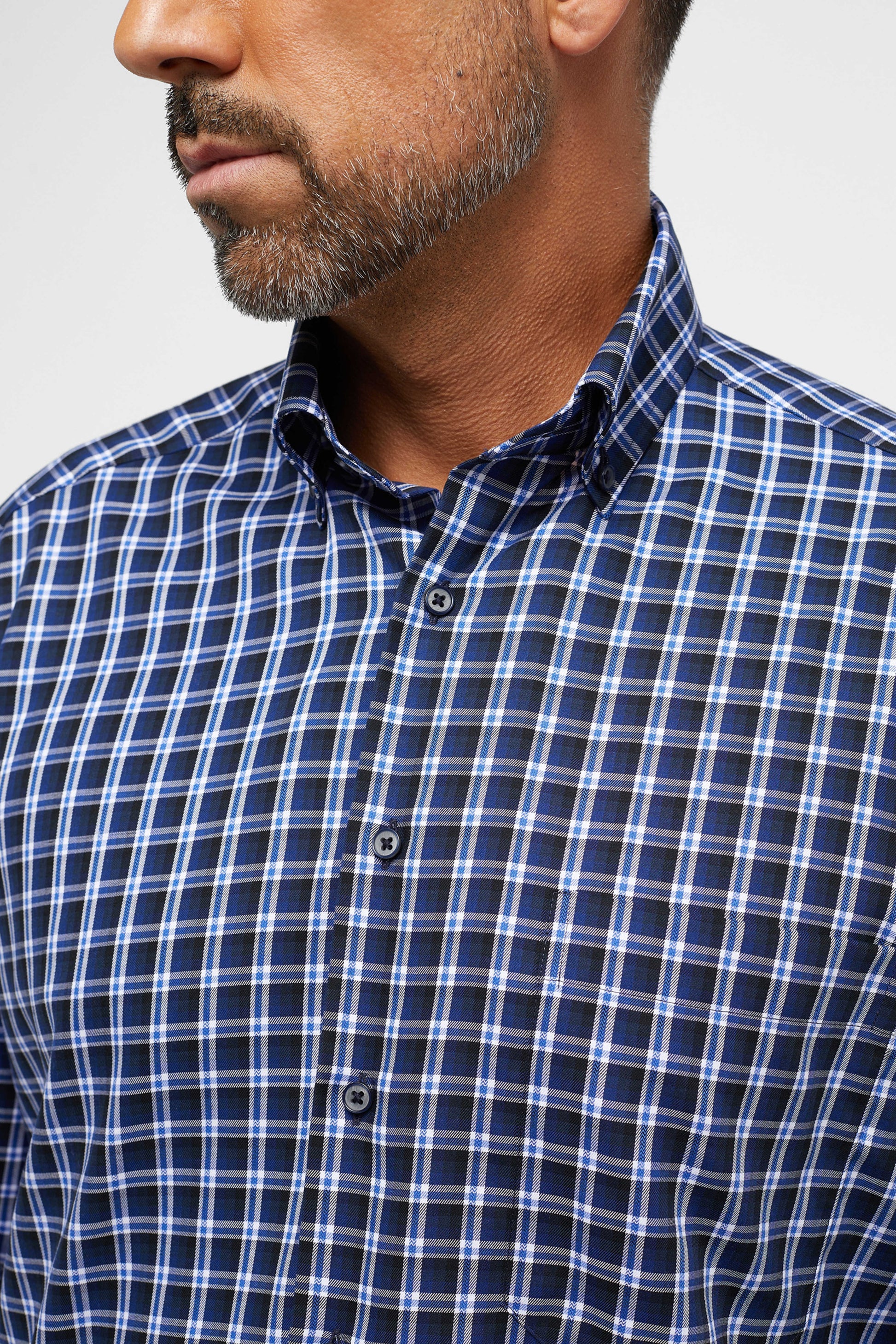 Klassisk Eterna skjorte i blå ternet twillvævning, der kombinerer et tidløst design med høj komfort. Skjorten har en praktisk brystlomme, en stilfuld button-down krave samt matchende knapper, der understreger den elegante helhed.