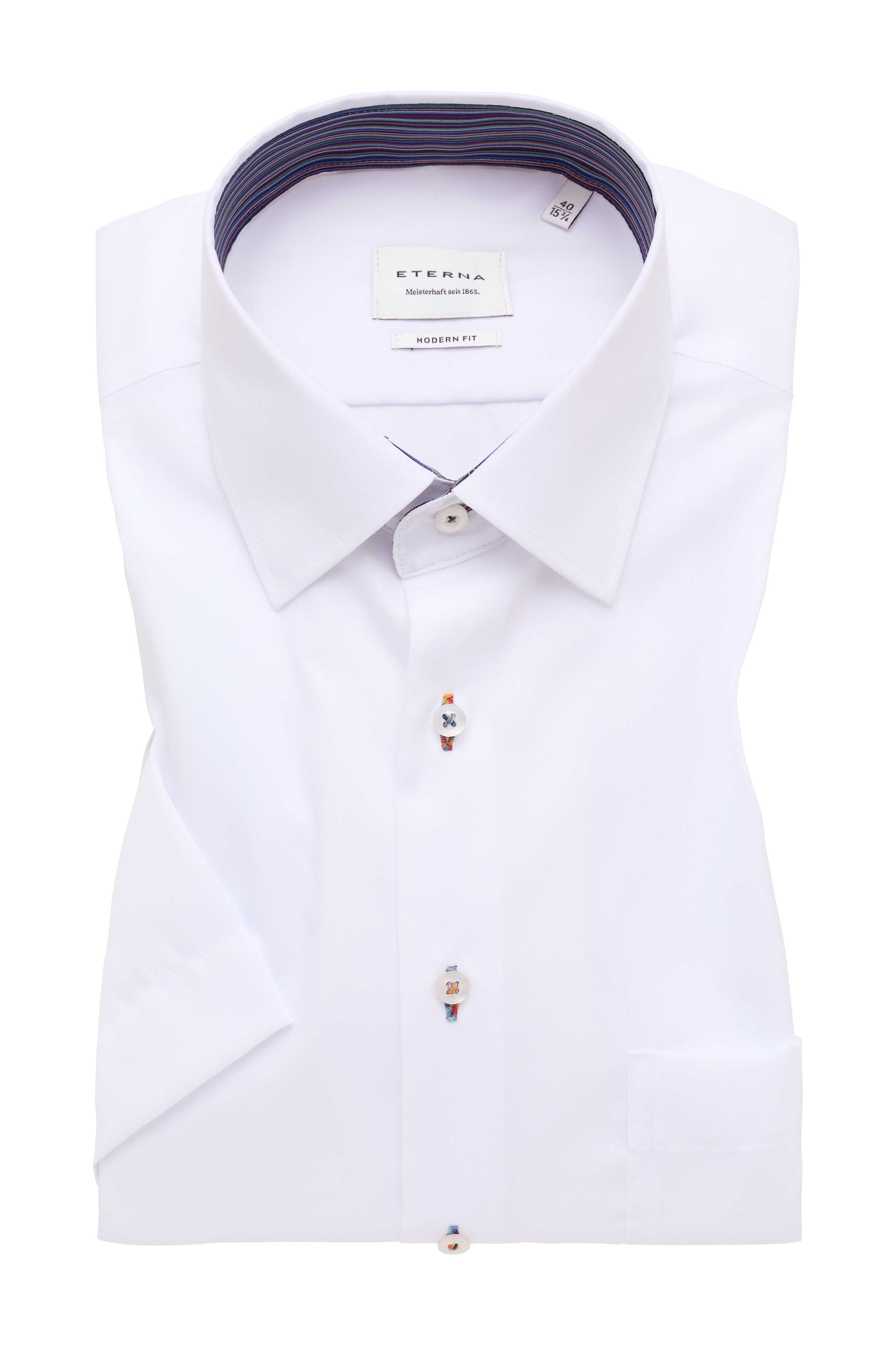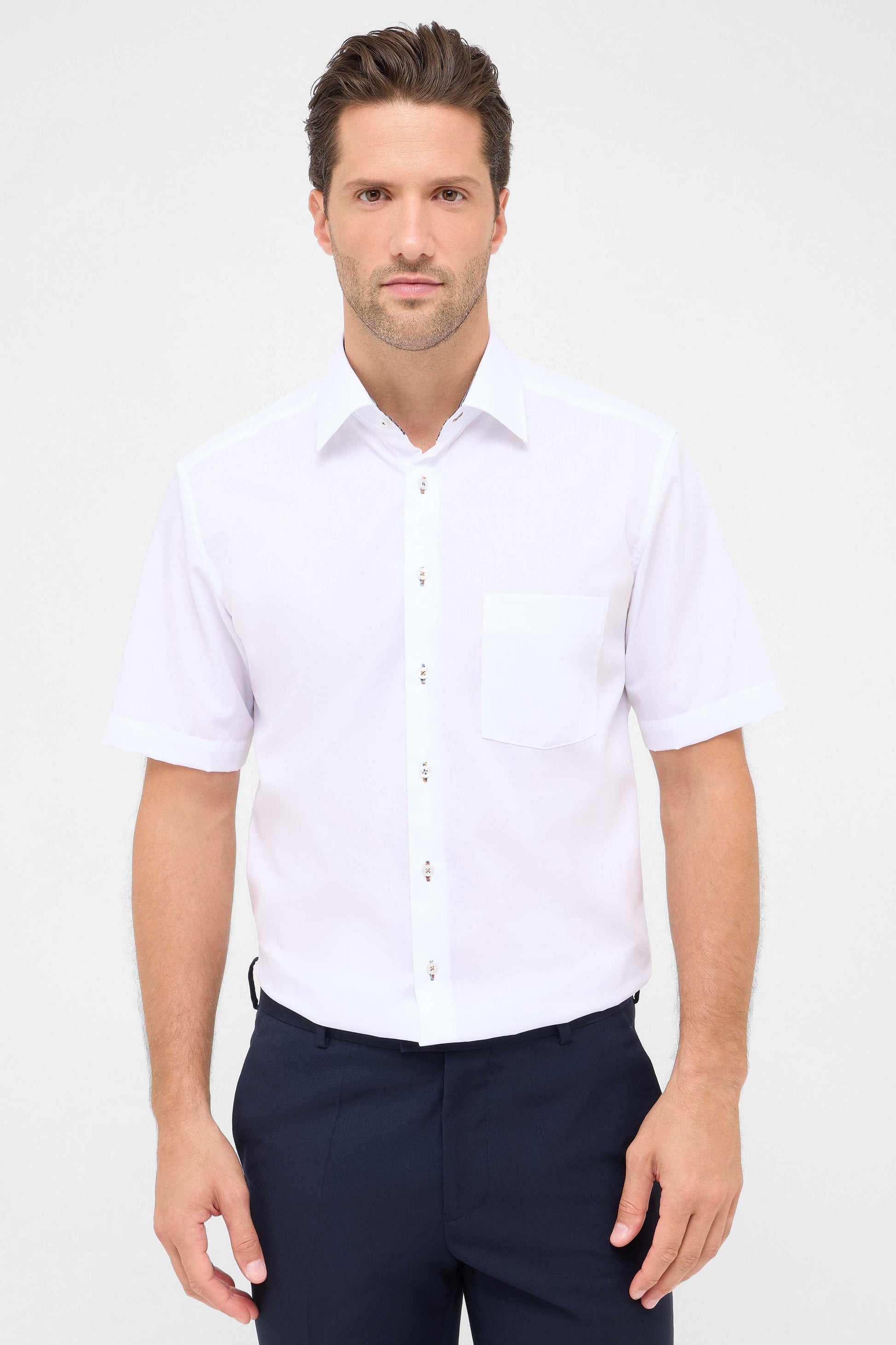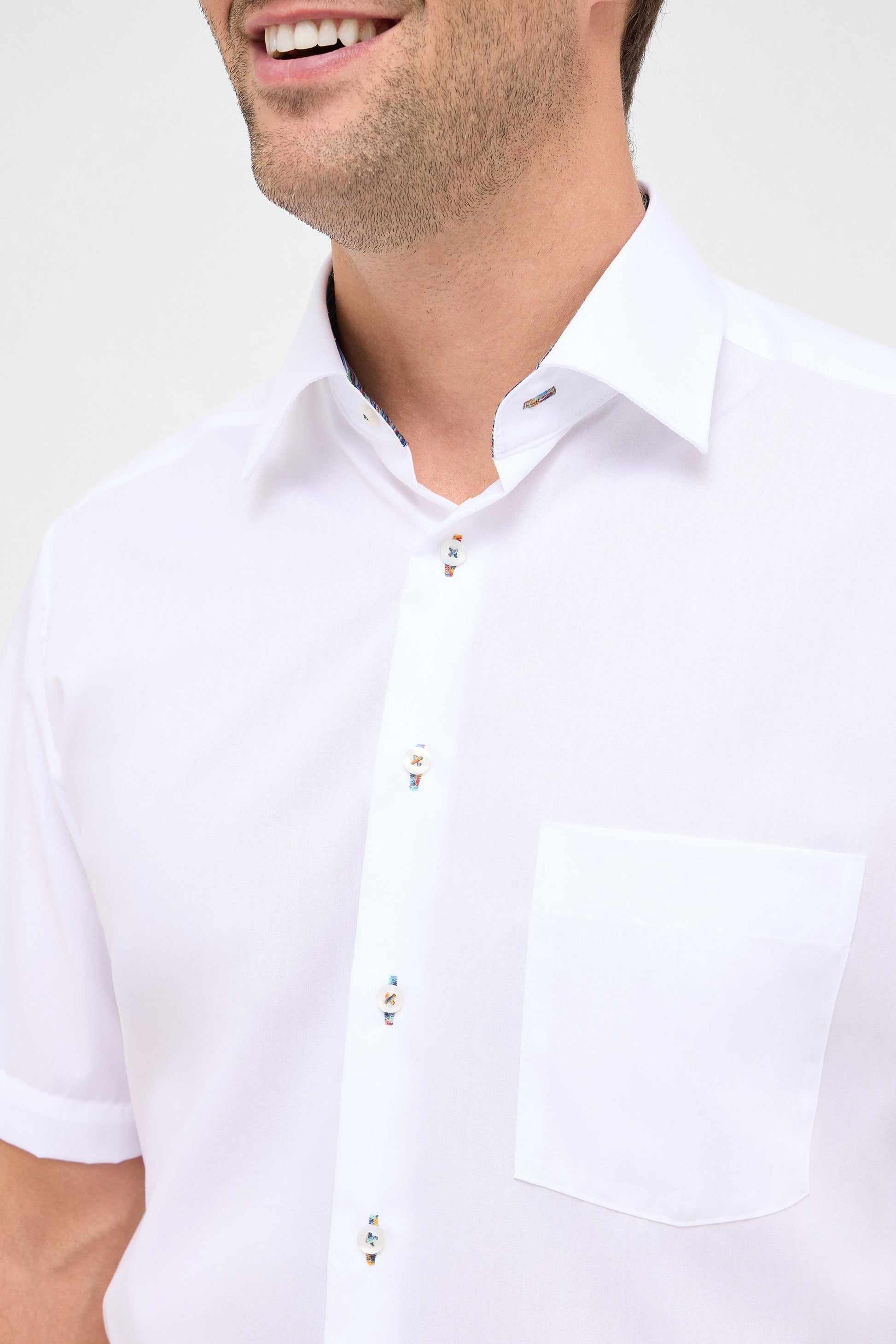 Tidsløs kortærmet klassiker til din garderobe Eterna Comfort Fit poplin skjorte med kontrastmønster i krave. Strygefri skjorte er fremstillet af 100% bomuld, hvilket sikrer optimal komfort hele dagen. Afrundet og normal længde, kan bæres afslappet over bukserne. Denne skjorte findes i flere farver.