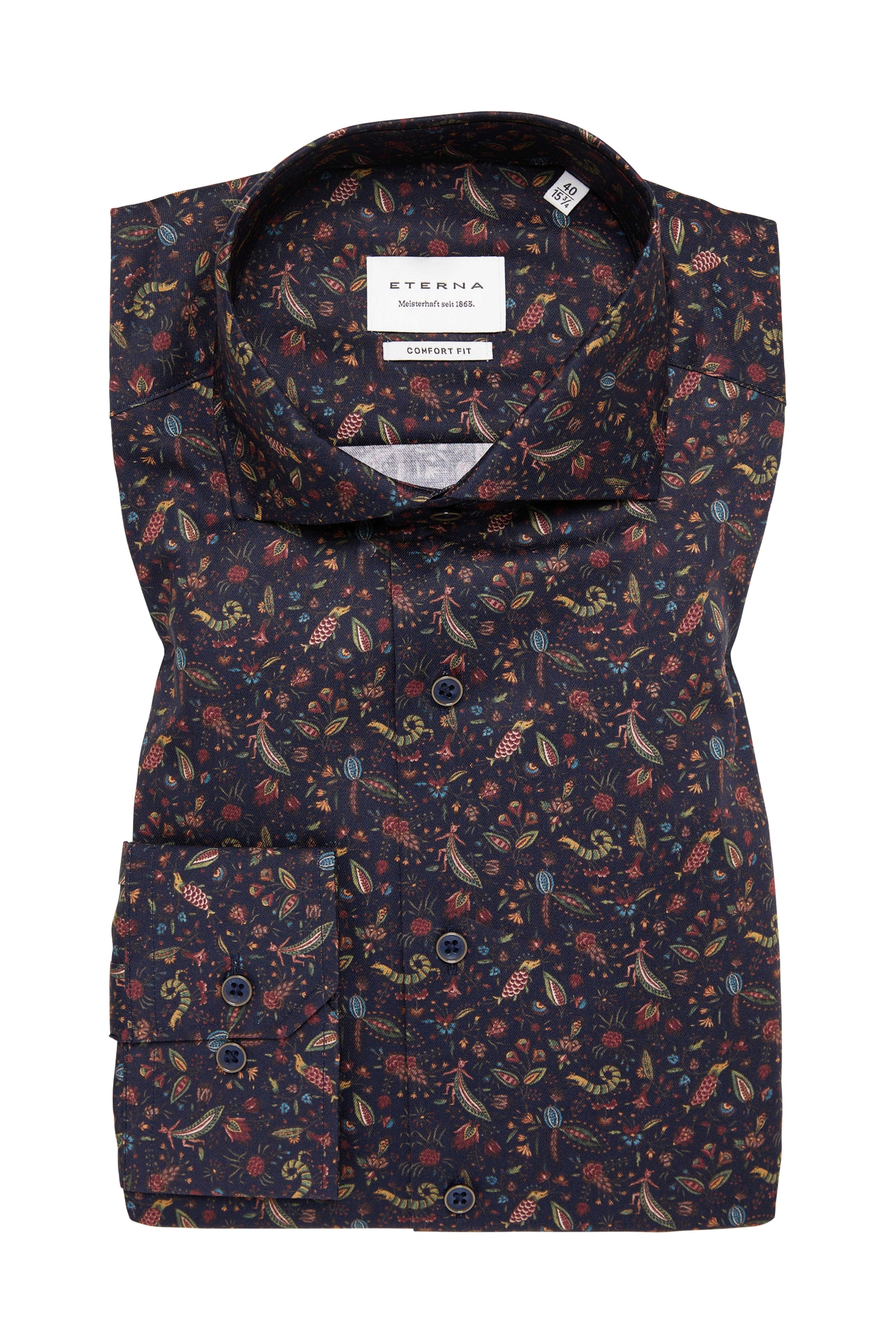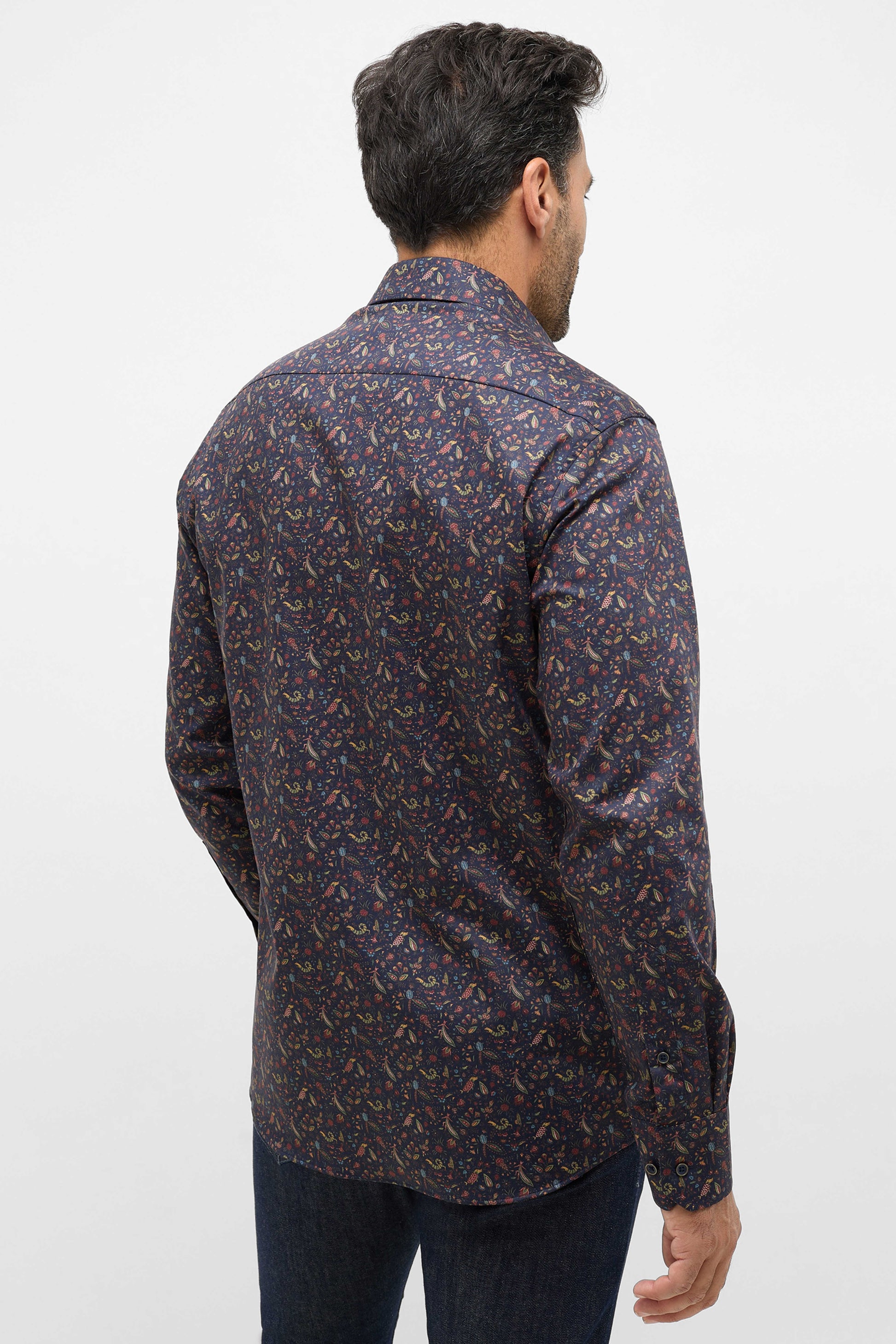 Flot mørkeblå skjorte fra Eterna med elegant print mønster, mørke knapper, cut-away krave og uden brystlomme. Skjorten er designet i Comfort Fit, hvilket giver ekstra plads, især omkring maven, og sikrer en behagelig og afslappet pasform.