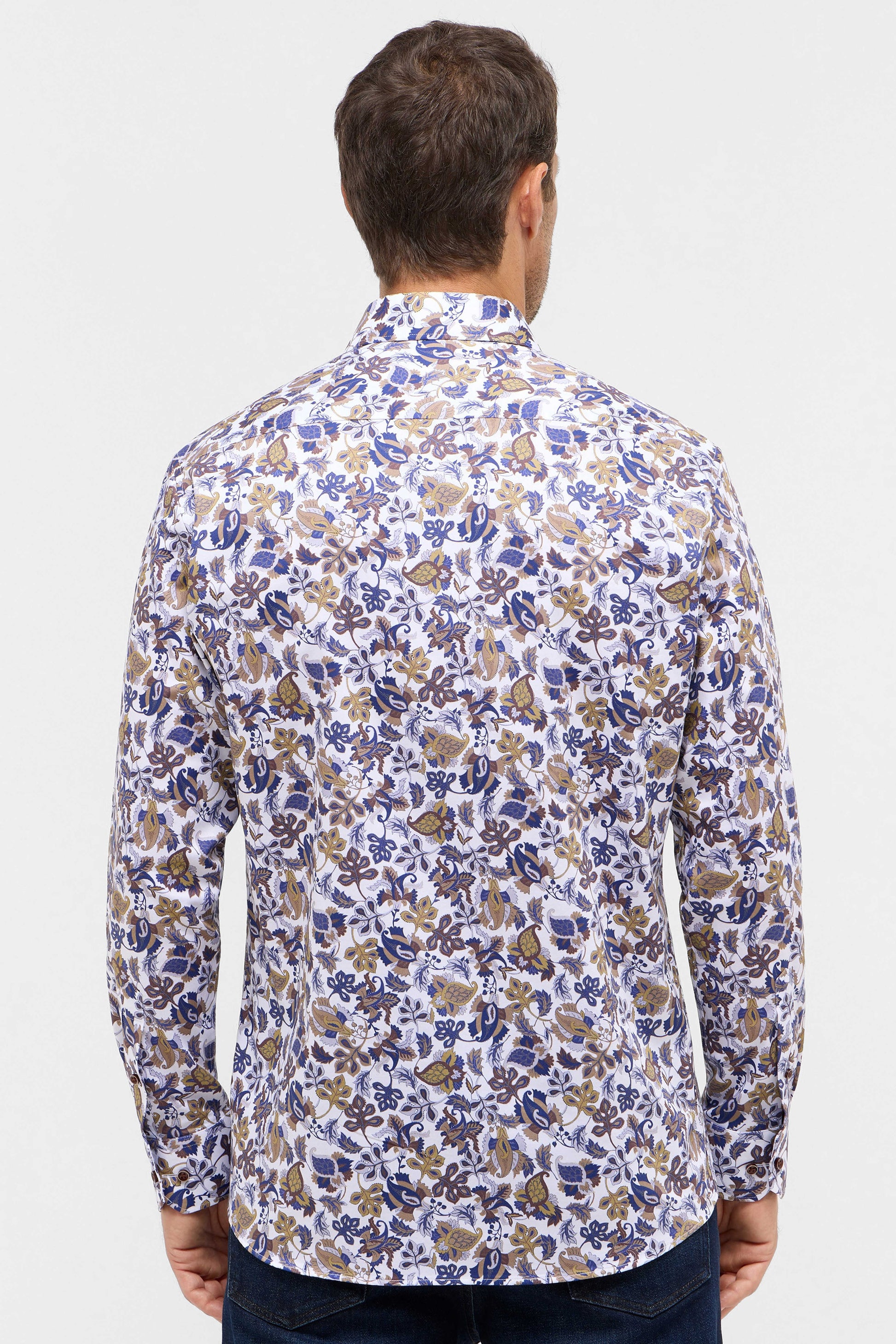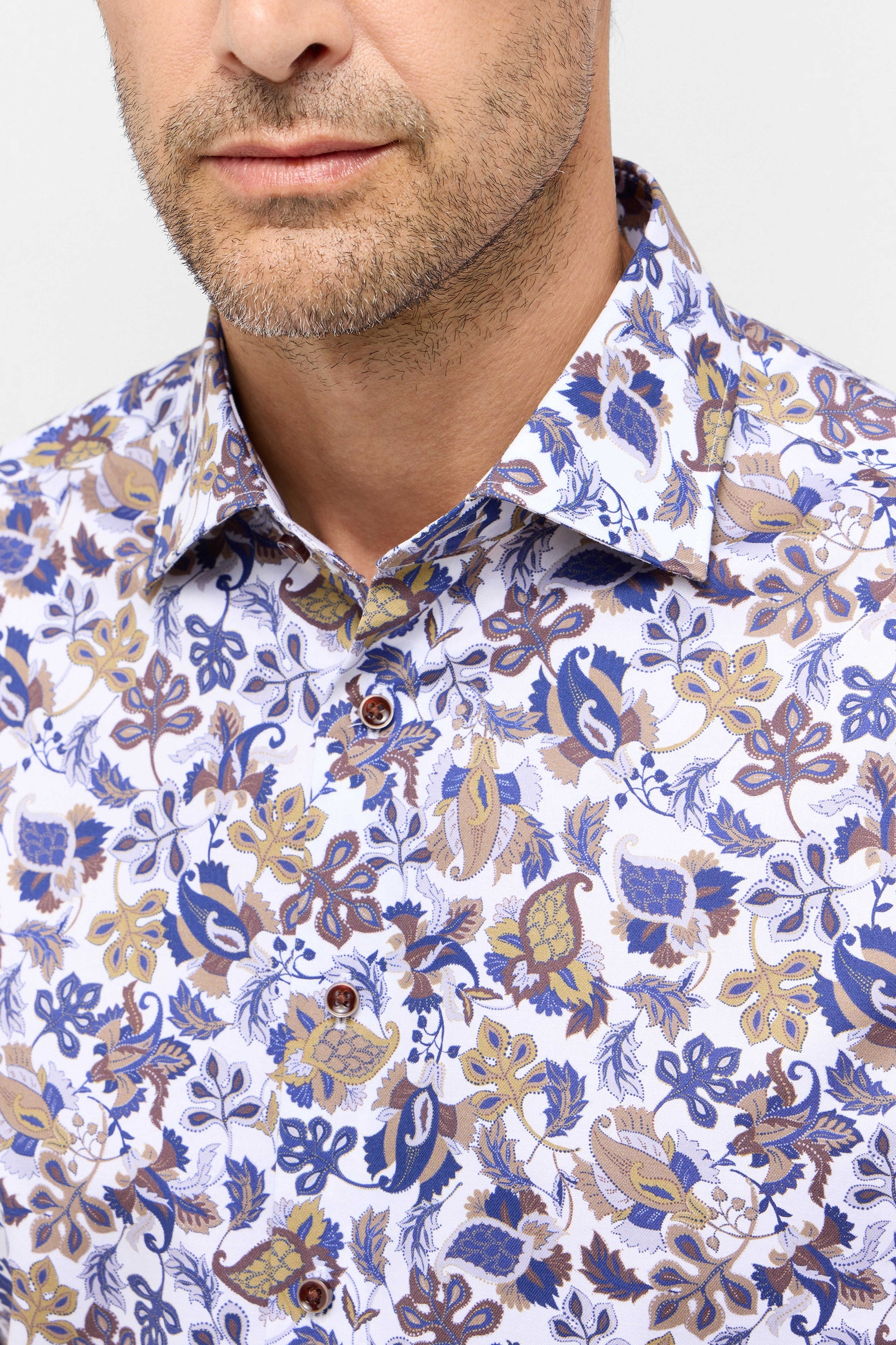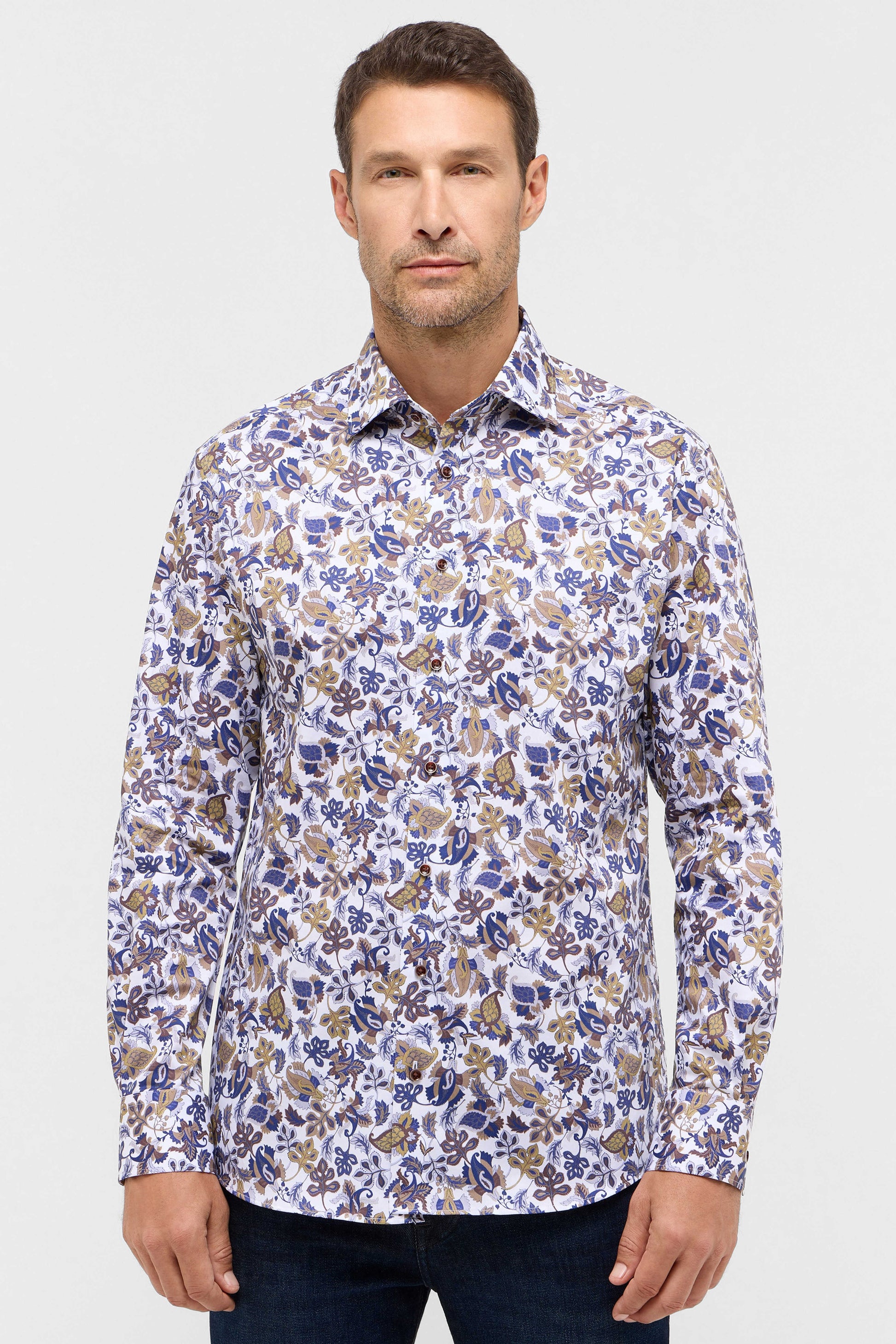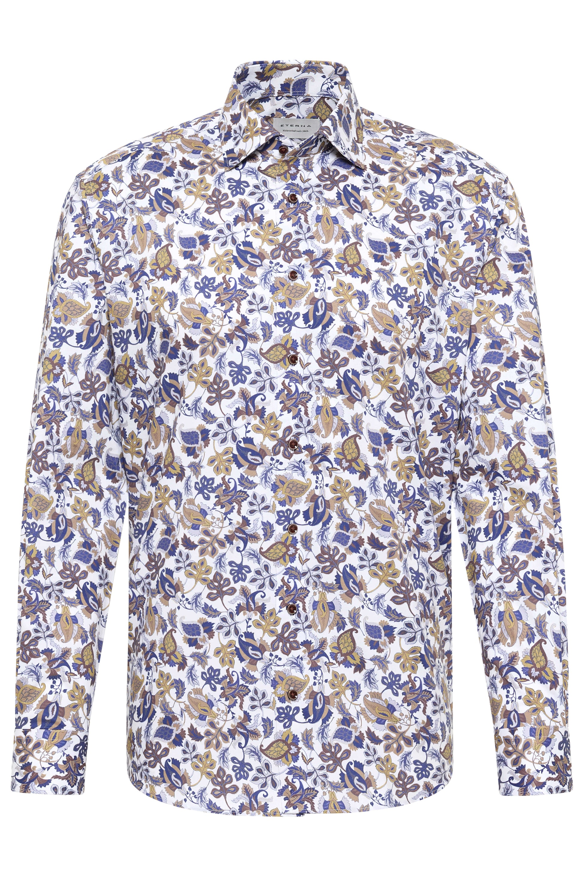 Opgrader din garderobe med denne stilfulde Eterna Comfort Fit print skjorte med sennepsgul, brun og blåt motiv. Denne strygefri struktur skjorte er fremstillet af 100% bomuld, hvilket sikrer optimal komfort hele dagen. Afrundet og normal længde, kan bæres afslappet over bukserne. Skjorten findes i flere farver.