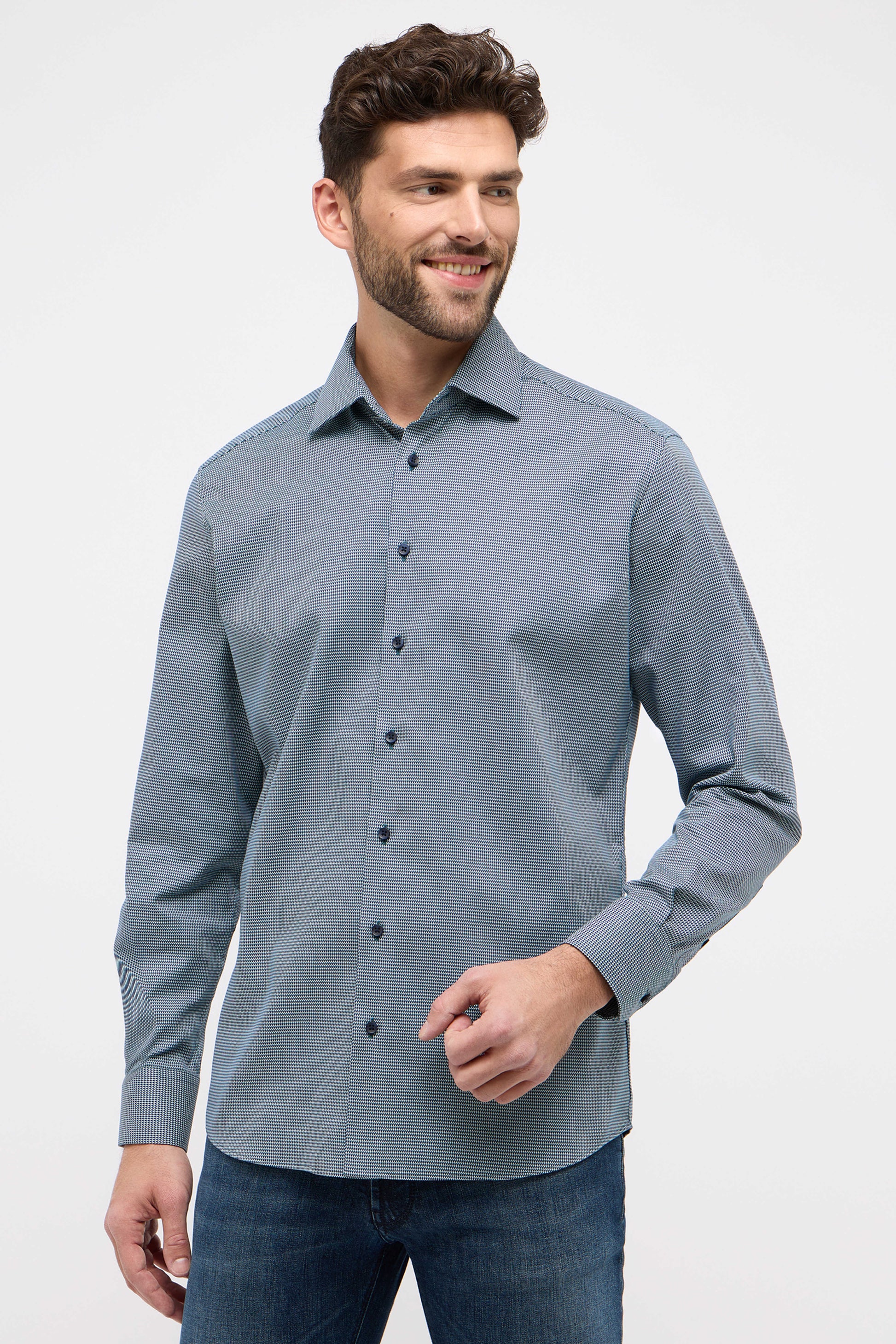 Flot blågrøn strukturvævet skjorte fra Eterna med mørke kontrastknapper og uden brystlomme for et stilrent og moderne udtryk. Den let figursyede Modern Fit-pasform giver en flot silhuet og passer de fleste mænd – blot maven ikke er for stor.