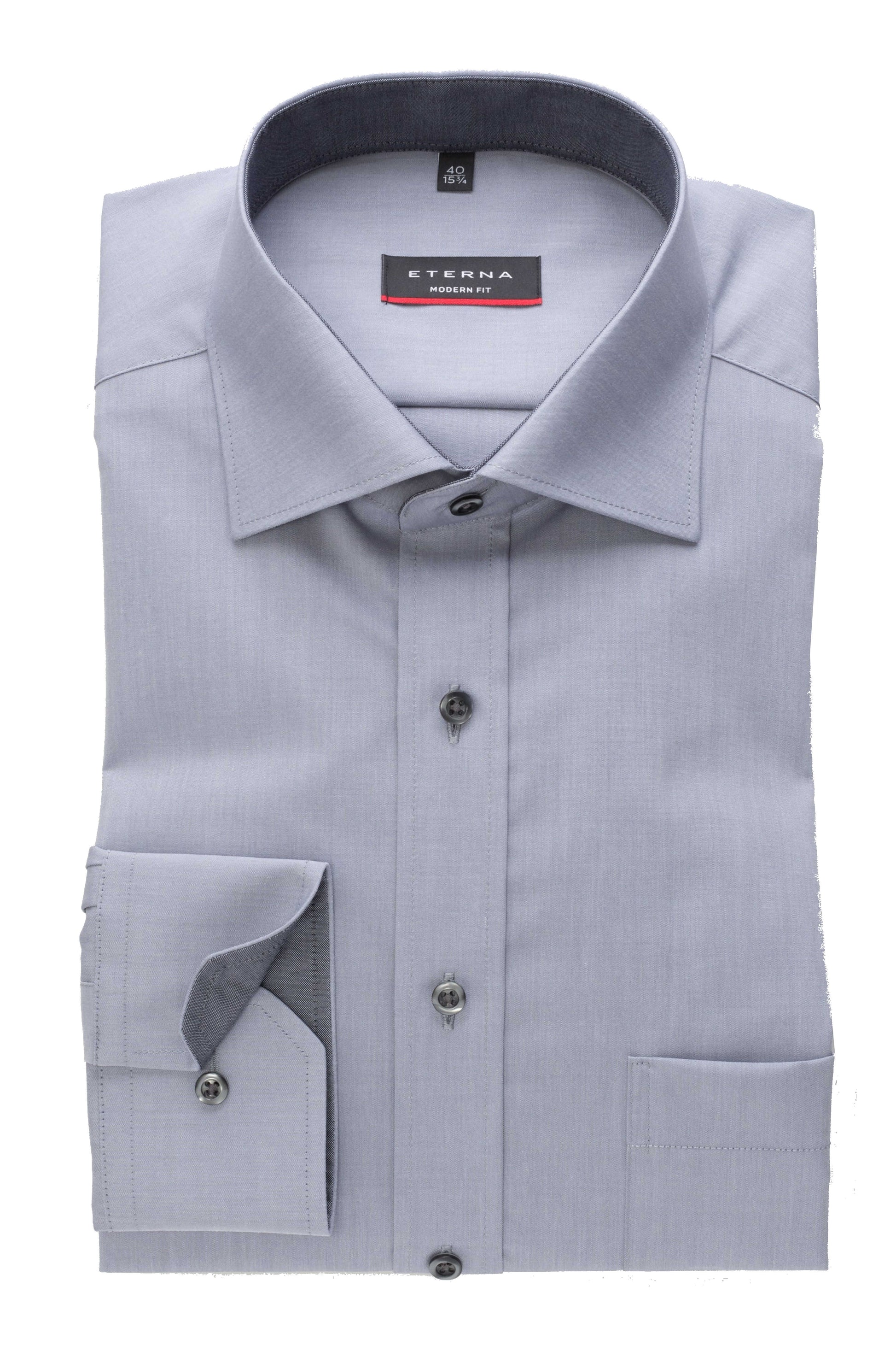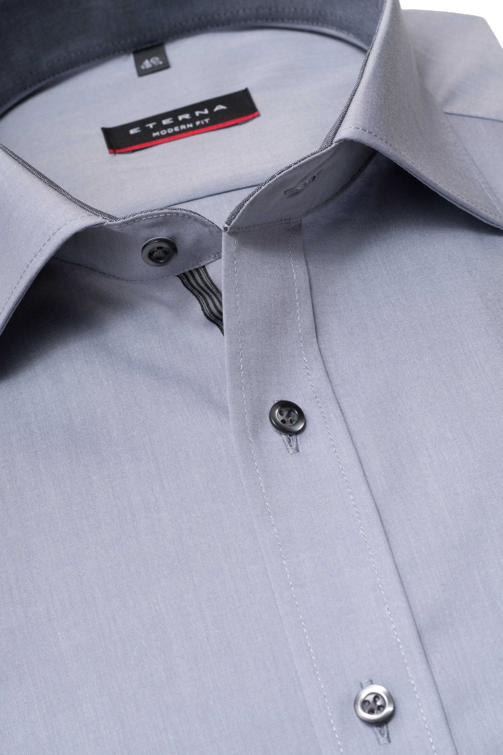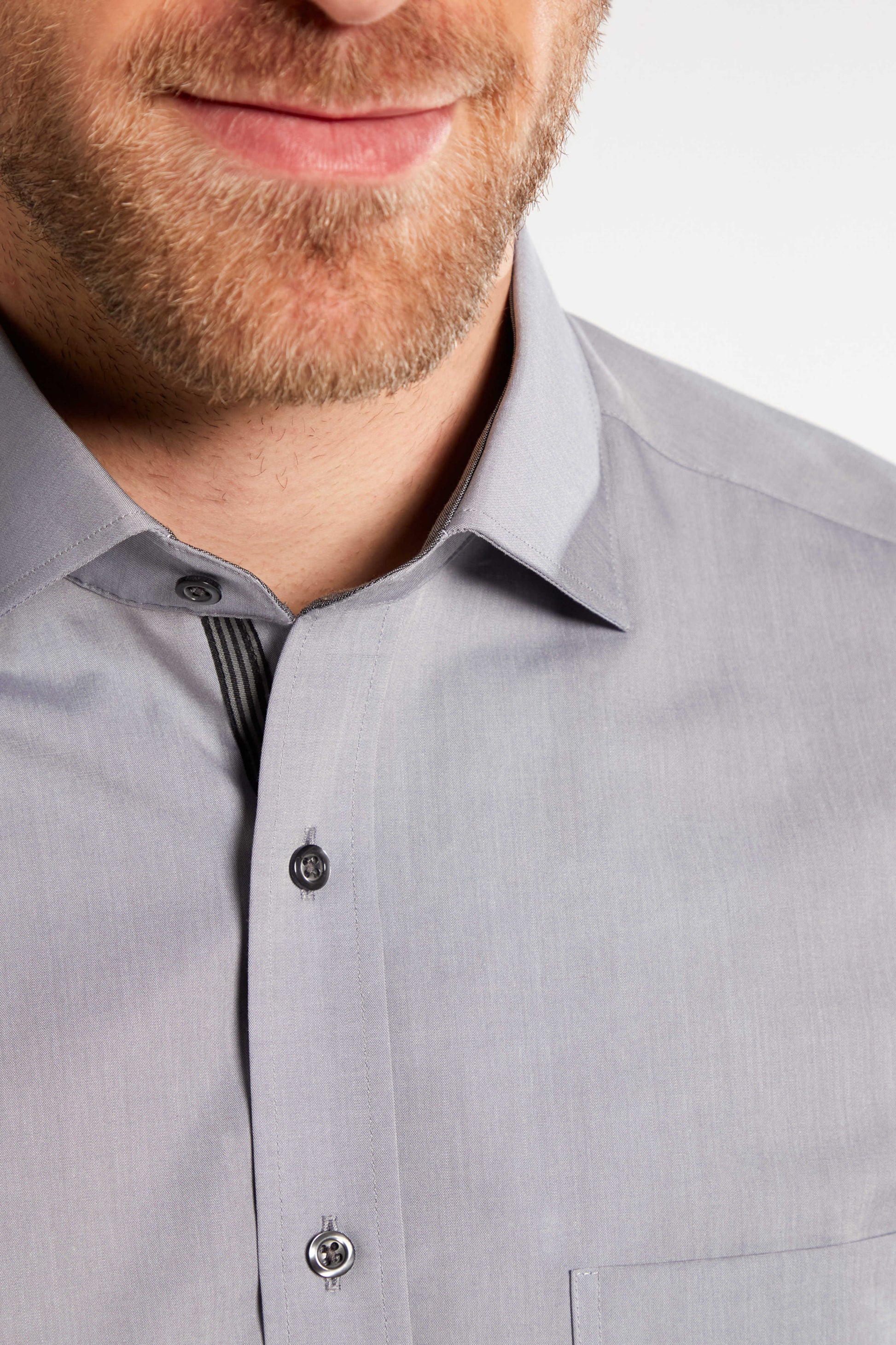 Flot lysegrå poplin skjorte fra Eterna med mørkegrå knapper syet med matchende tråd samt kontrastfarve i krave og manchet. Skjorten har en almindelig Kent-krave, brystlomme og en tidløs Modern Fit-pasform, der passer de fleste mænd – blot maven ikke er for stor.