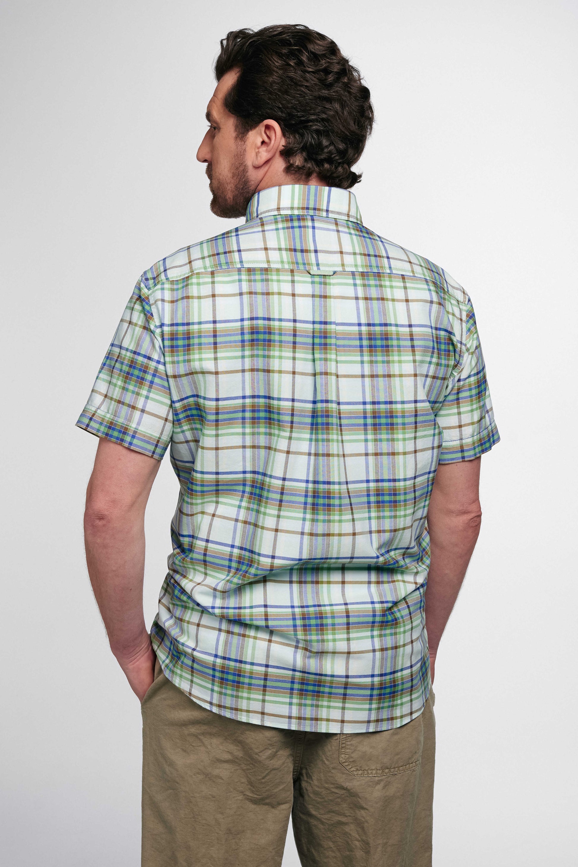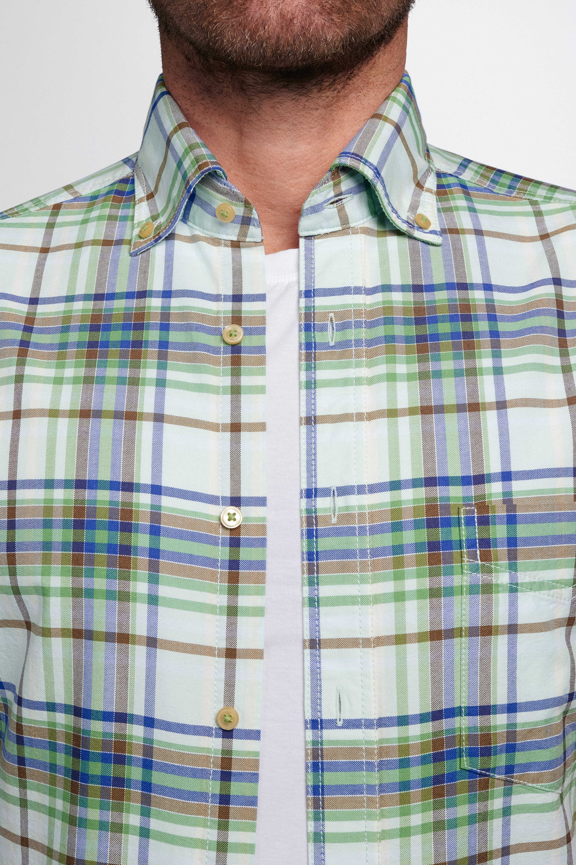Flot blå og grøn ternet kortærmet Oxford herreskjorte fra Eterna’s bæredygtige upcycling-serie.