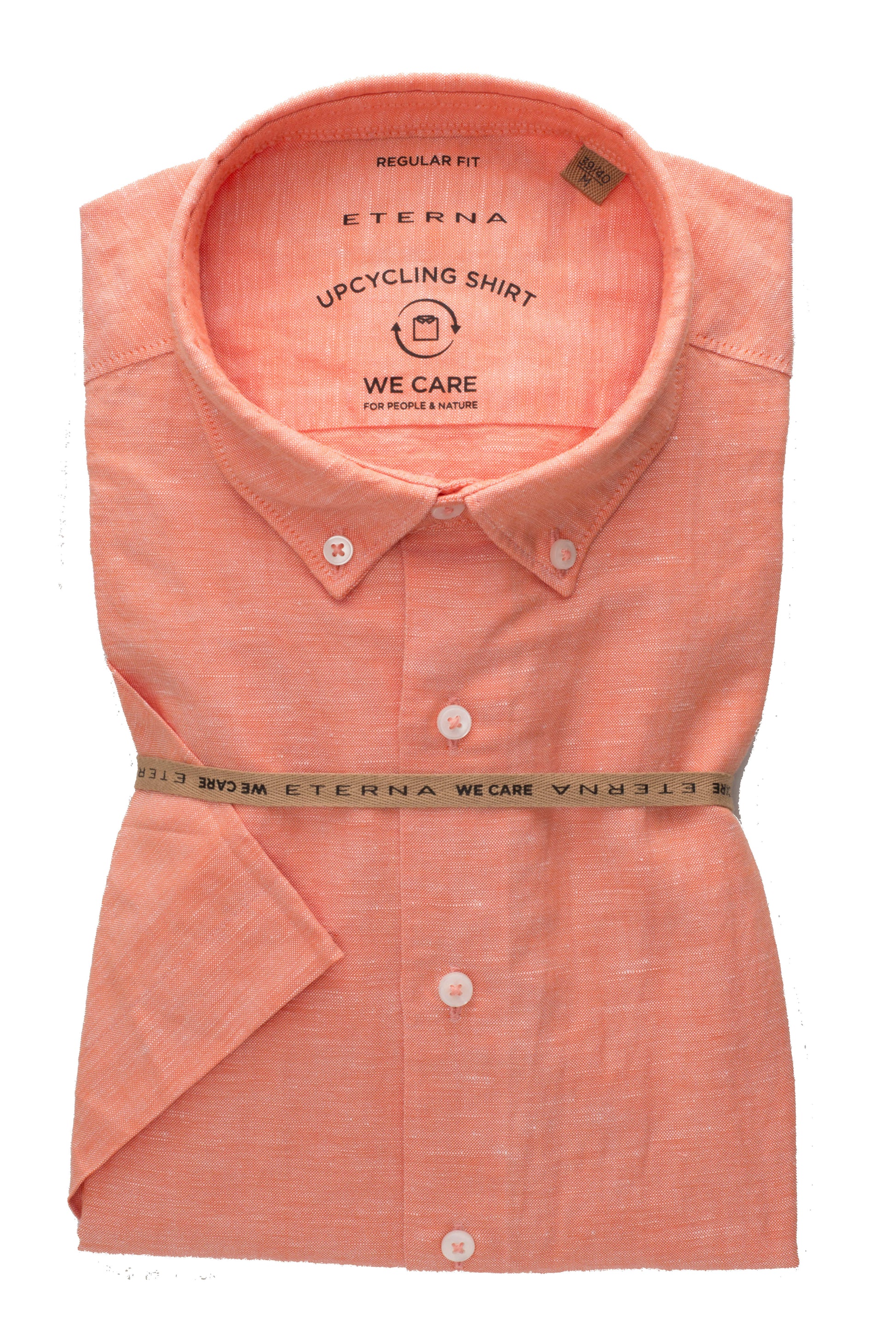 Flot kortærmet hørskjorte fra Eterna i lækker laksefarve (orange) eller blå med button-down krave og matchende knapper syet med matchende tråd. Skjorten er uden brystlomme og har en Regular Fit-pasform, der giver god plads og passer til mænd med almindelig kropsbygning.