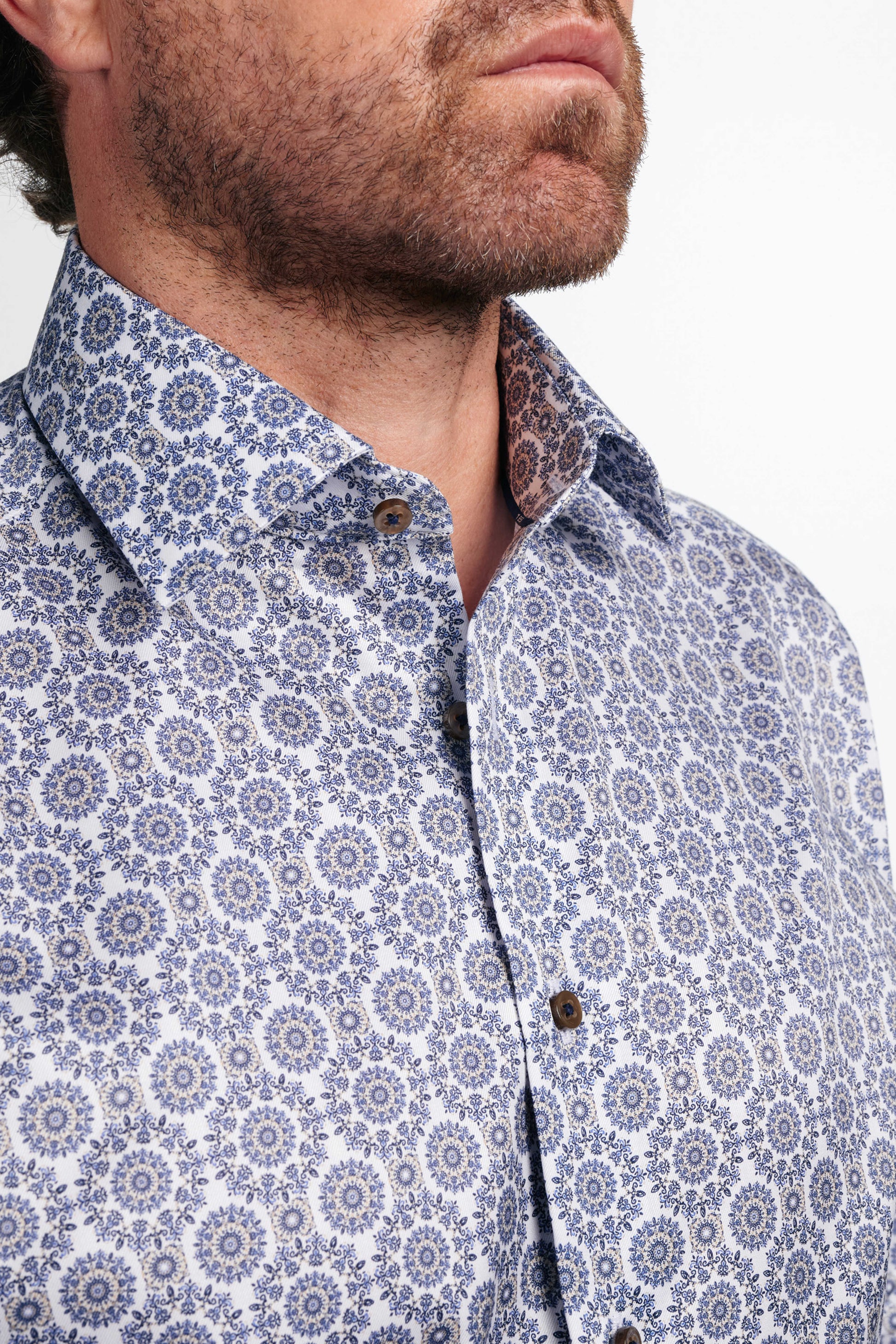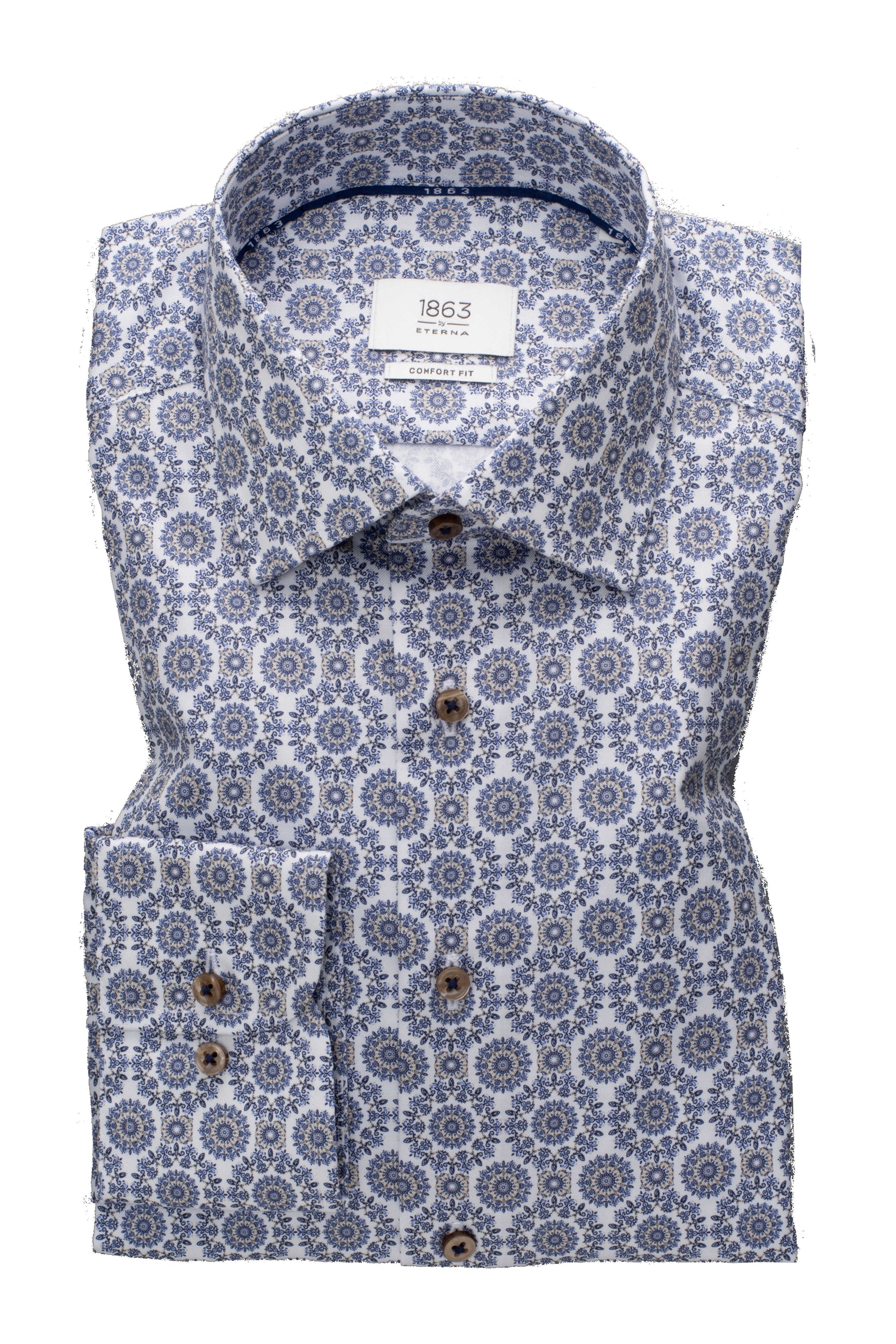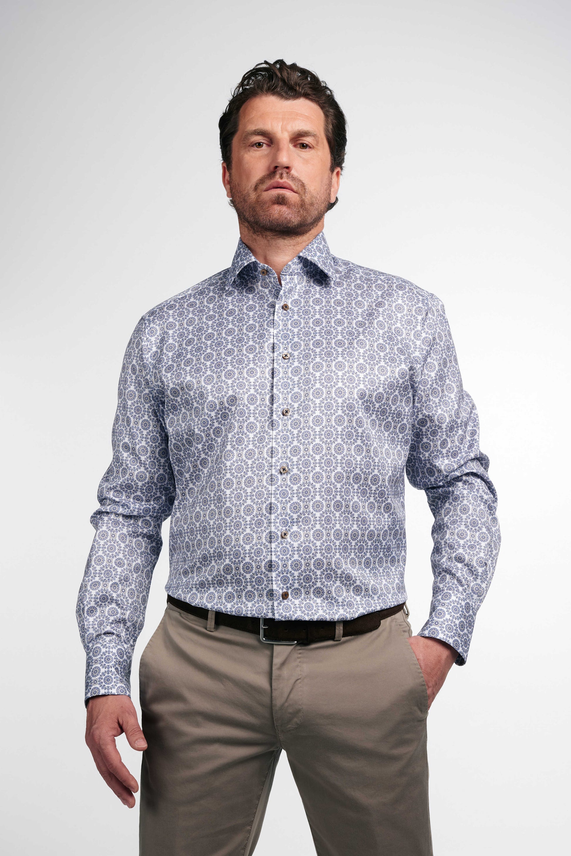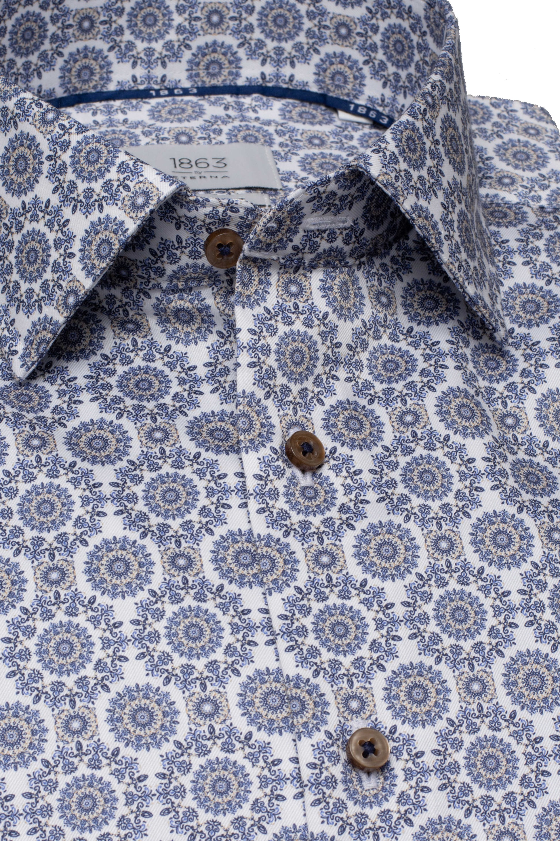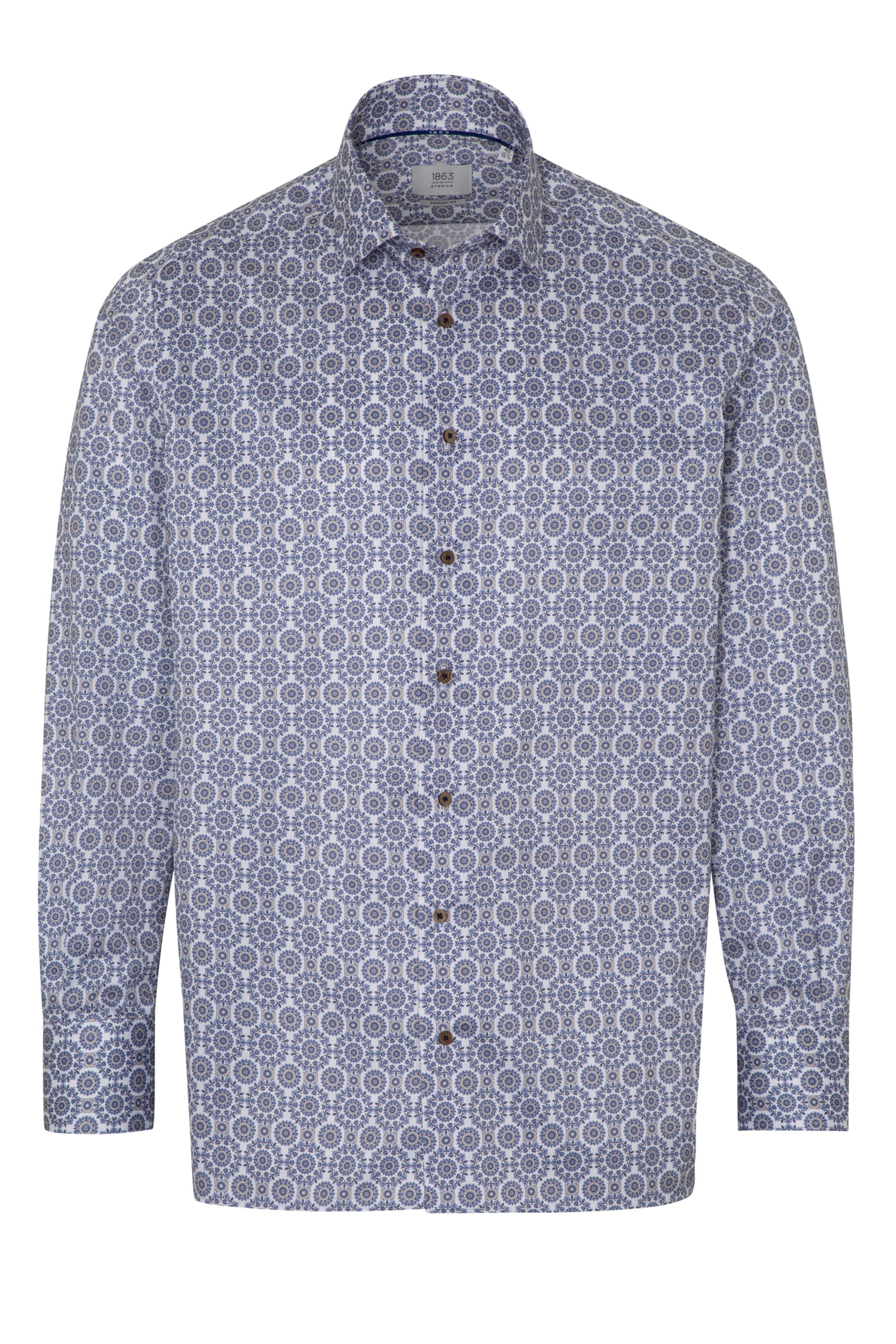 Eterna by1863 – Premium herreskjorte i Twill med blåt og sandfarvet motiv