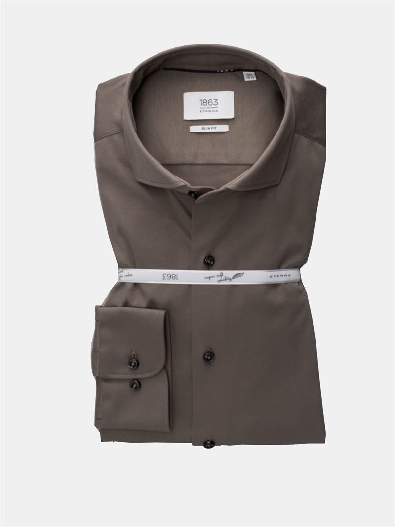 Smart og lækker blød taupe Jersey skjorte Super Soft vævet i exclusiv italiensk TWO PLY (vævet af dobbelttråd). Denne eksklusive serie kaldes 1863 by Eterna opkaldt efter det år Eterna blev stiftet i Wien.