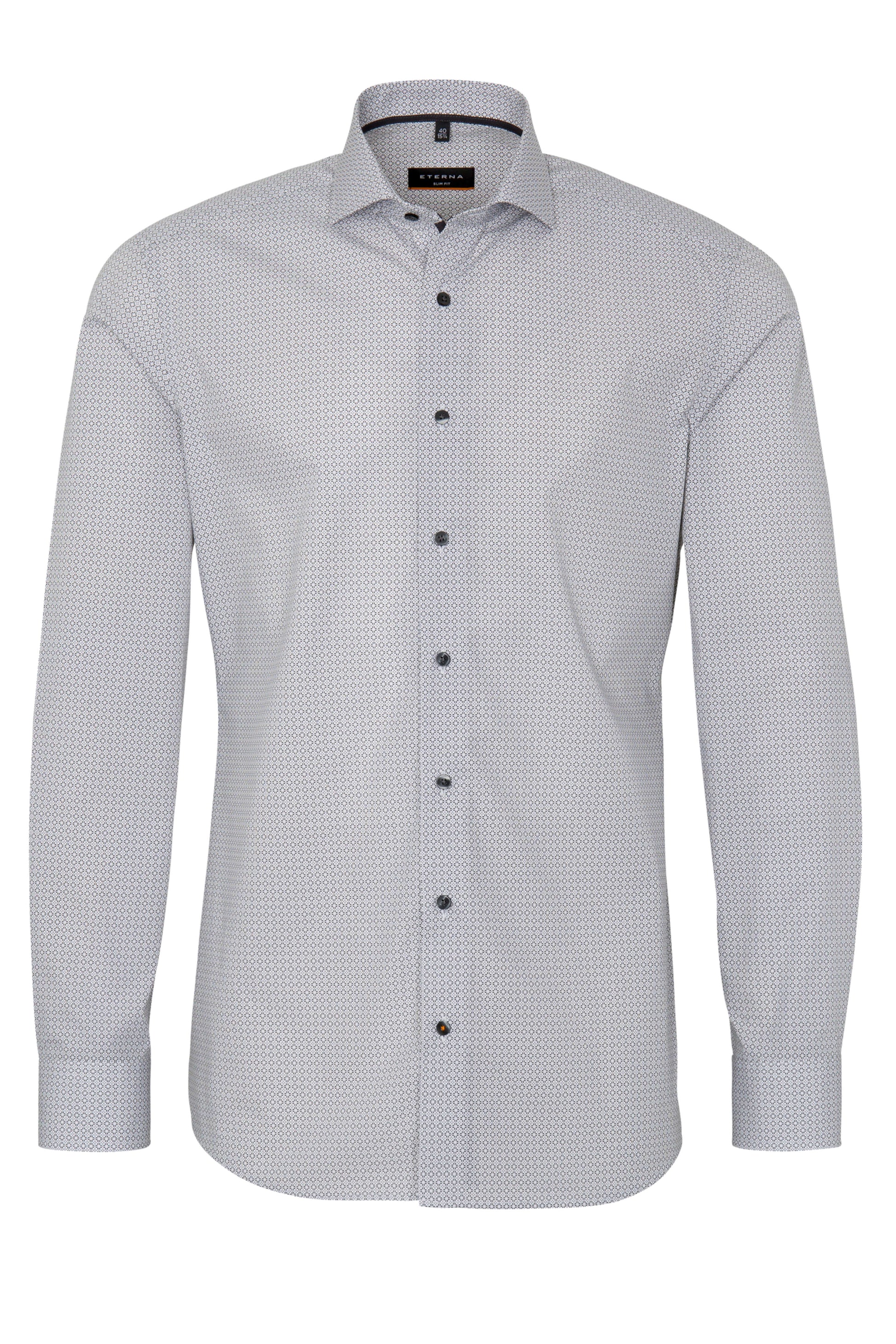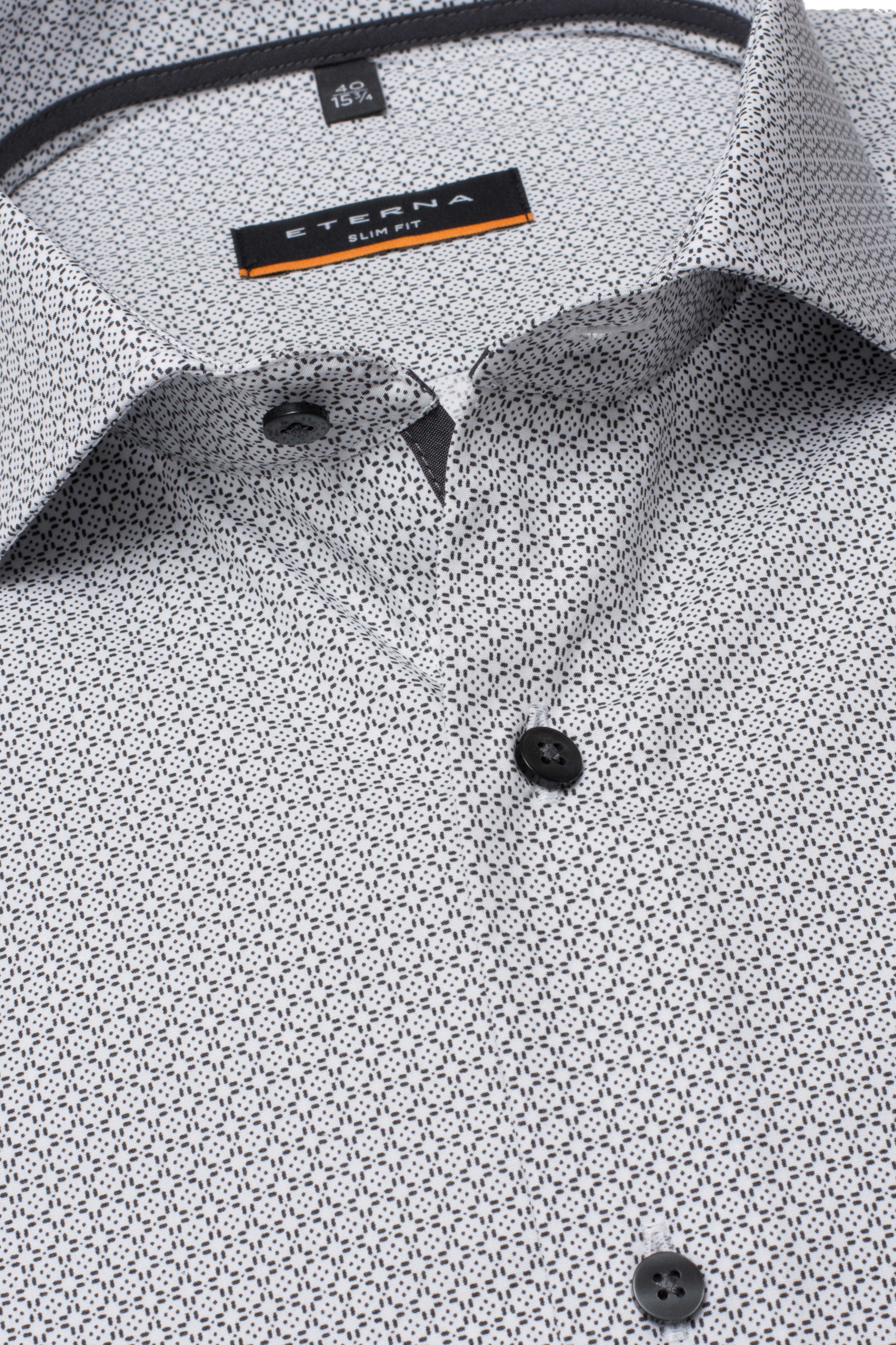Elegant poplin skjorte fra Eterna i flot grå og hvidt mønster. Skjorten har cut-away krave, mørke knapper og er uden brystlomme for et rent og stilfuldt udtryk.