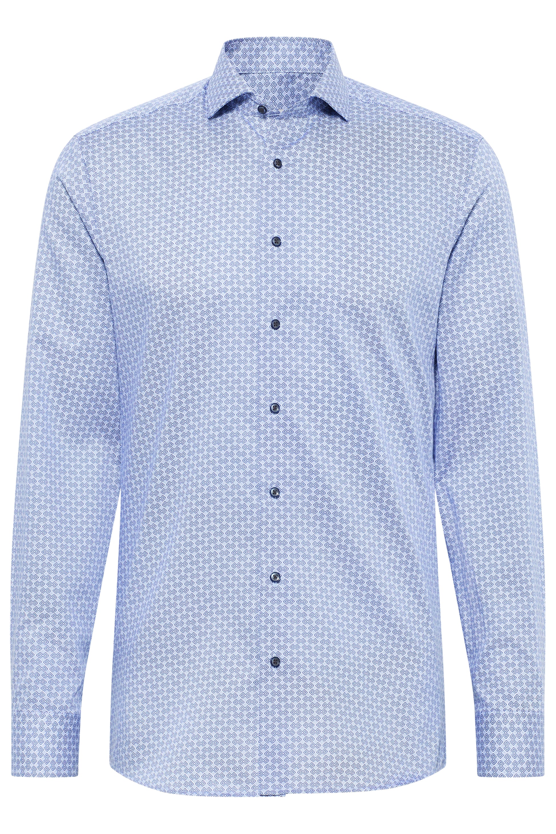 Skil dig ud med denne smarte blå print skjorte fra Eterna Slim Fit - serien. Skjorten har et elegant printmønster, der giver et moderne og stilfuldt udtryk. Med cut-away krave og mørkeblå knapper påsyet med matchende tråd er denne skjorte designet til den stilbevidste mand, der ønsker et skarpt look – både på kontoret og til festlige lejligheder.