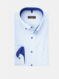 Bomulds vævningen med strækeffekt giver overfladen en virkelig flot struktur. Med mørke knapper og Button-down krave (knappes). Uden brystlomme.