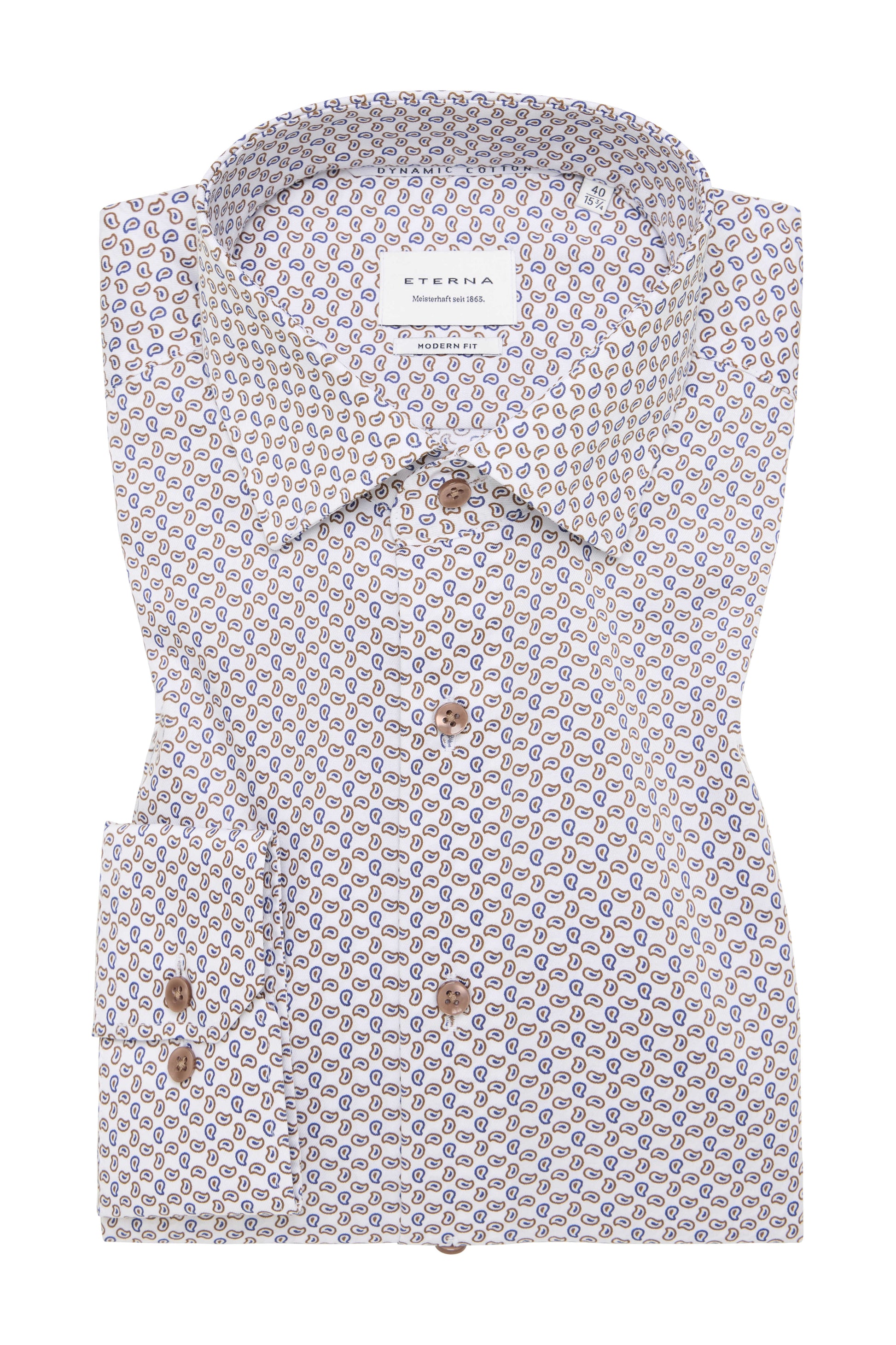 Opgrader din garderobe med denne stilfulde Eterna Modern Fit twill print skjorte cremet hvid med blå og sandfarve. Denne strygefri twill skjorte er fremstillet af 100% bomuld, hvilket sikrer optimal komfort hele dagen. Afrundet og normal længde, kan bæres afslappet over bukserne. Skjorten er i Dynamic Cotton en ny teknologi der giver bomuld med strækeffekt.