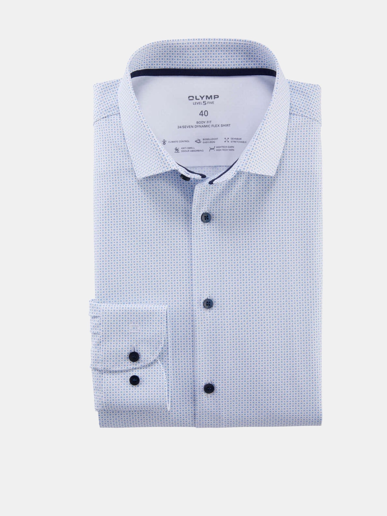 Smart print skjorte med blå farve fra tyske Olymp. Kent krave, mørke knapper og uden brystlomme. 24/Seven dynamic flex med ekstra strækeffekt.